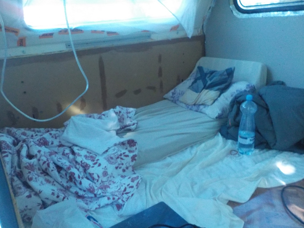 A więc sprawy wyjazdowe. Bardzo się bałem jechać nocą pierwszy raz z przyczepą. Początkowe kilometry to 70-80 km/h i nerwowe patrzenie w lusterka. W pewnej chwili w ogóle zapomniałem ,że coś ciągnę (ciężka Previa i pusta cepka). A zapomnienie wyglądało tak,że jak sobie przypomniałem,że ciągnę niewiadkę to na liczniku było 120-130 km/h. A więc pierwsze koty za płoty i podejrzewam, że technika jazdy z cepką zostaje odfajkowana.Tyle z przeszłości. Teraz "czasy obecne". Nie mam wszystkich zdjęć z poczynionych prac (zbudowane i pomalowane bakisty na "fabrycznych wymiarach" tylko zamiast oryginalnego otwierania mam stelaż z łożka (bez podparć w środku z racji ogrzewania podłogowego) ,po prawej stronie drzwi nie ma aneksu kuchennego tylko "pionierskie " łóżko w kształcie jakiegoś trapezu tzn w nogach przy drzwiach szer ok 50cm a w głowie ok 70cm.Jest to stelaż łóżka z pustą przestrzenią pod materacem "do zagospodarowania"