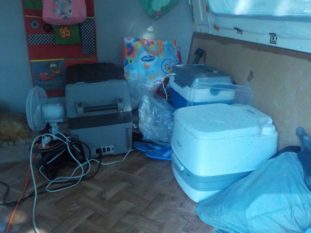 ) tam gdzie komoda to mamy zlew, a w samym kąciku (szersza część łóżka) jest suszarka do naczyń. Lodówkę mamy zaraz przy drzwiach, żeby nie trzeba było włazić do przyczepy za każdym razem.