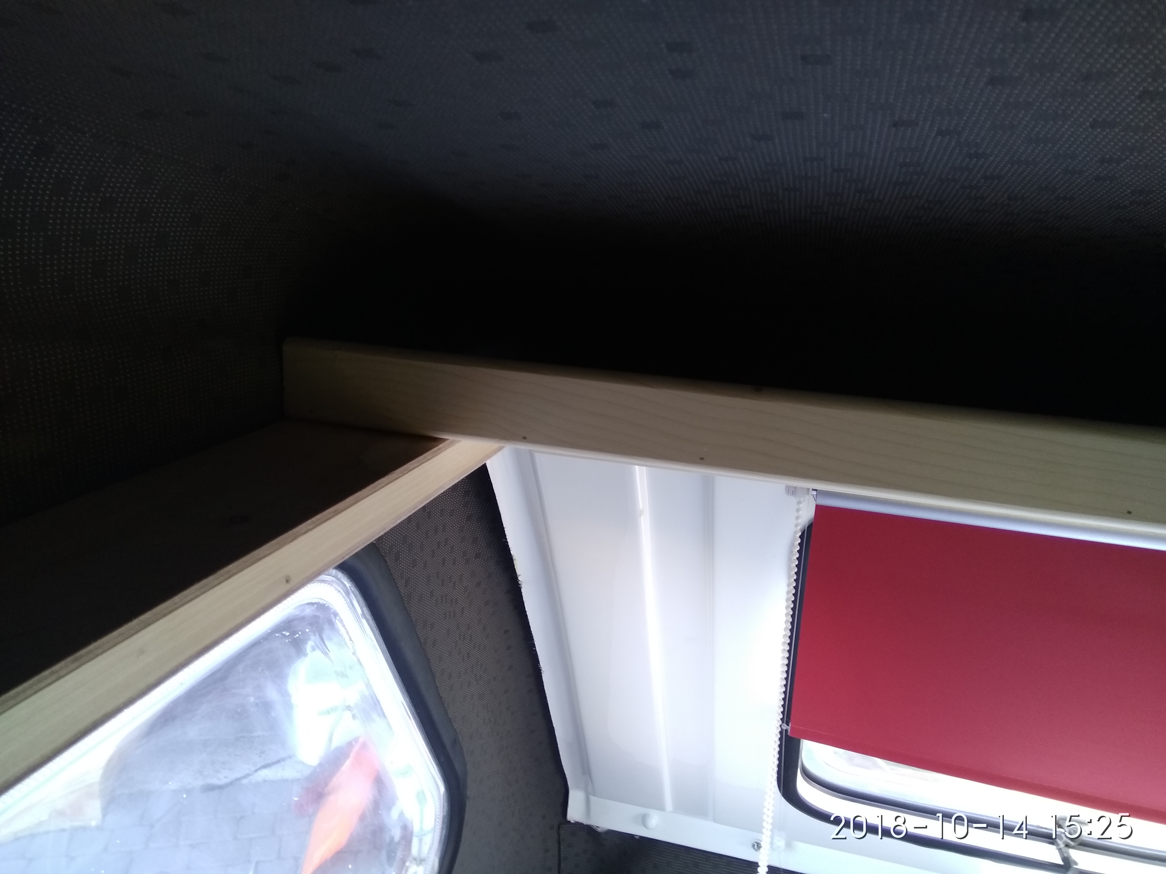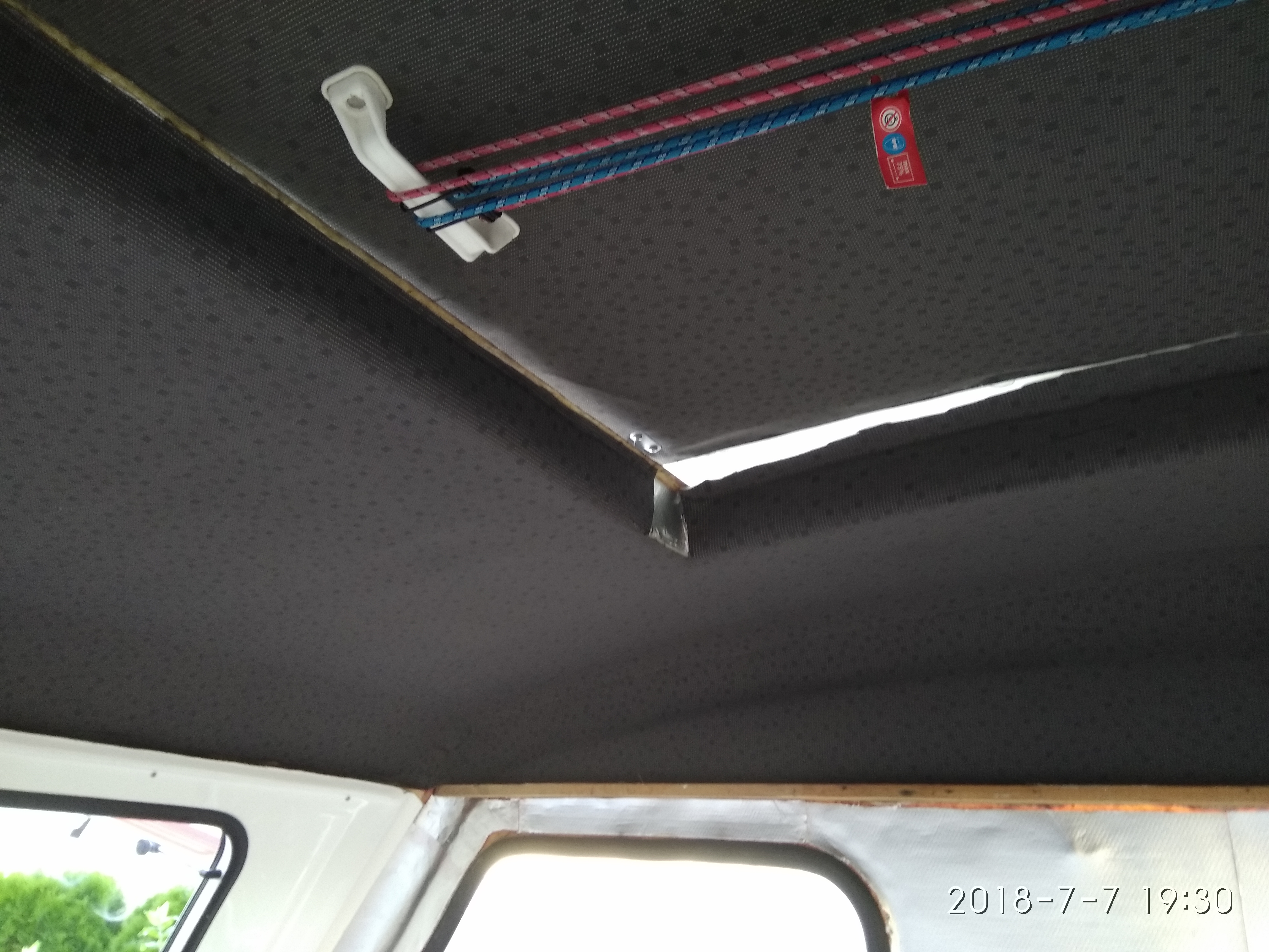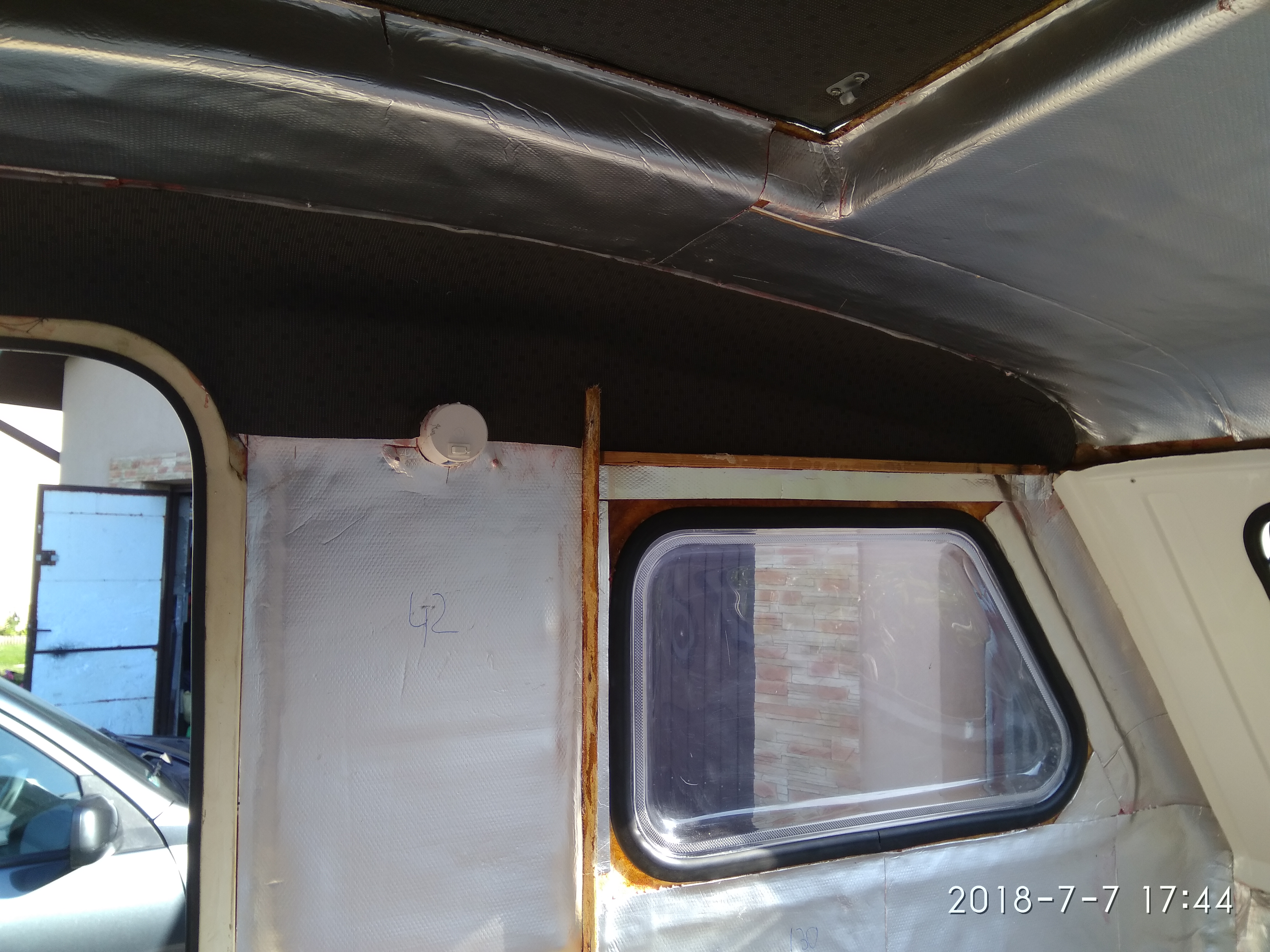 Kolejny etap wyklejanie tapicerki.Za radą kolegów zacząłem od dachu, najpierw klejąc boczne półksiężyce, następnie sufit w jednym kawałku. Tu potrzebowałem pomocy drugiej osoby, samemu problematyczna operacja. Na drugi ogień idą boki ścian, na końcu planuje przykleić elementy pod dużymi oknami. Ładnie zakryją i wyrównają krzywizny ścian.