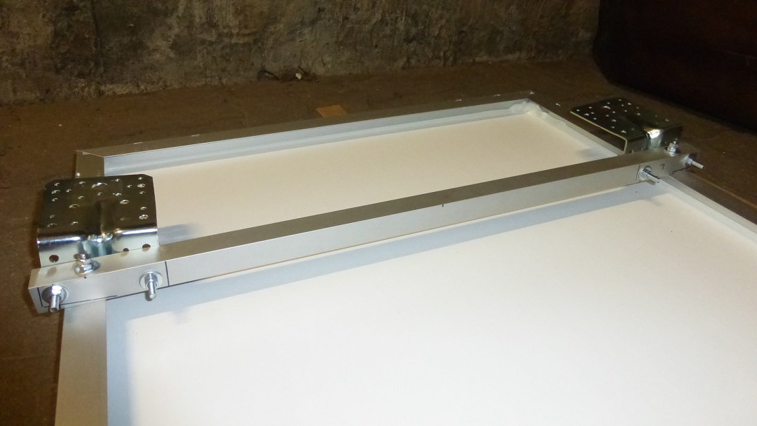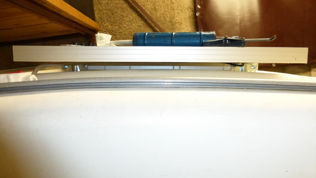 Zastosowałem dość duże kątowniki aby powierzchnia nacisku na budę była jak największa bo panel swoje waży. Kątowniki takie same jak dawałem w wielorybie, bardzo mocne i z usztywniającym tłoczeniem, nie tylko zagięte o 90°. Są symetryczne więc trzeba było je ciachnąć.