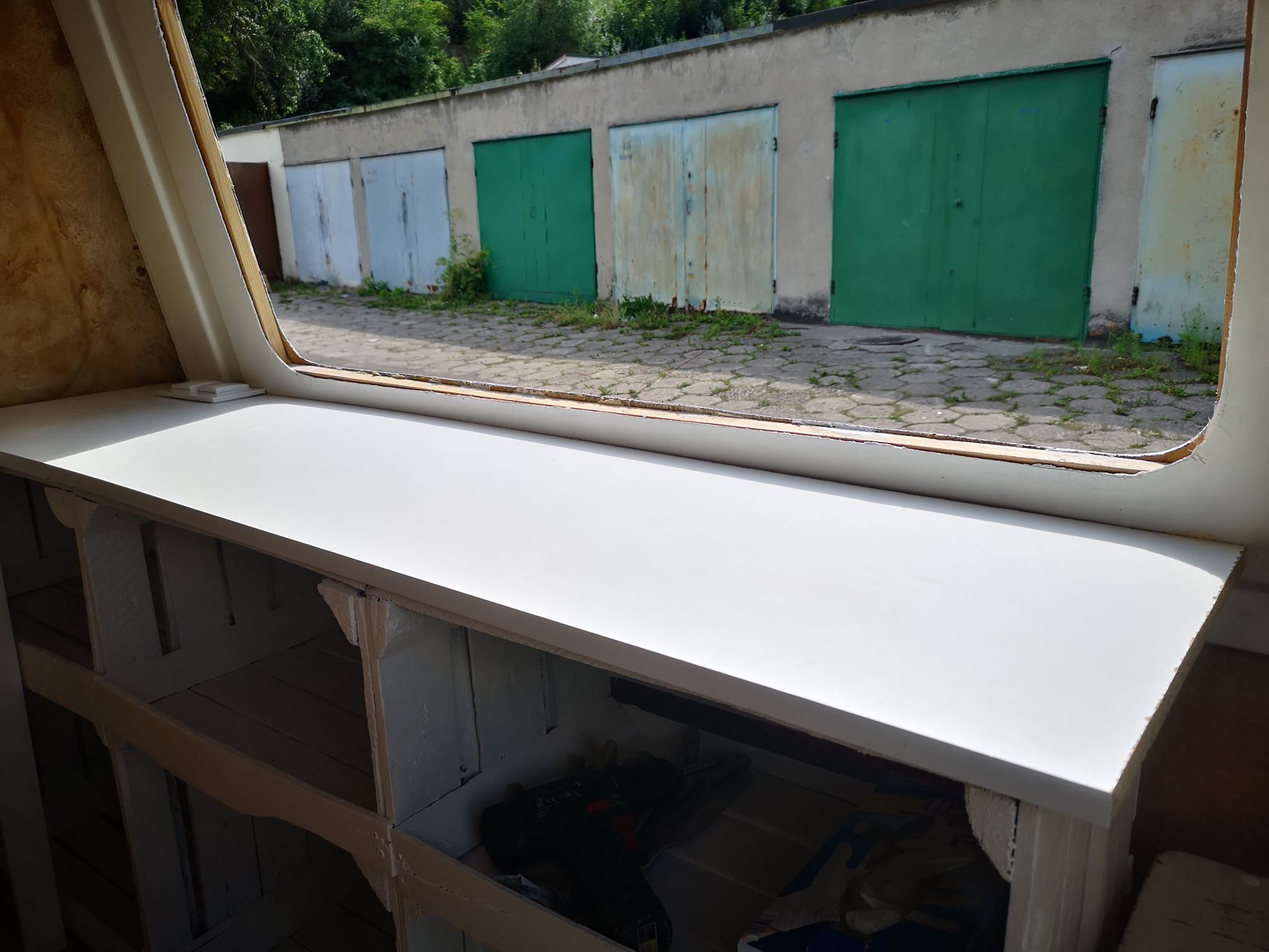 Żeby nie było, że się całkiem obijałem, na nowo docięte pokrywy łóżka w środku (wcześniej pokrywy nie otwierały się do końca) i docięty nowy blat na skrzynki (poprzedni byłą za wąski i nie zakrywał skrzynek za regałem, osadzony w nim kontakt. Skrzynki, regały i ekrany okien dostały po garści wkrętów aby wszystko się trzymało jak należy.