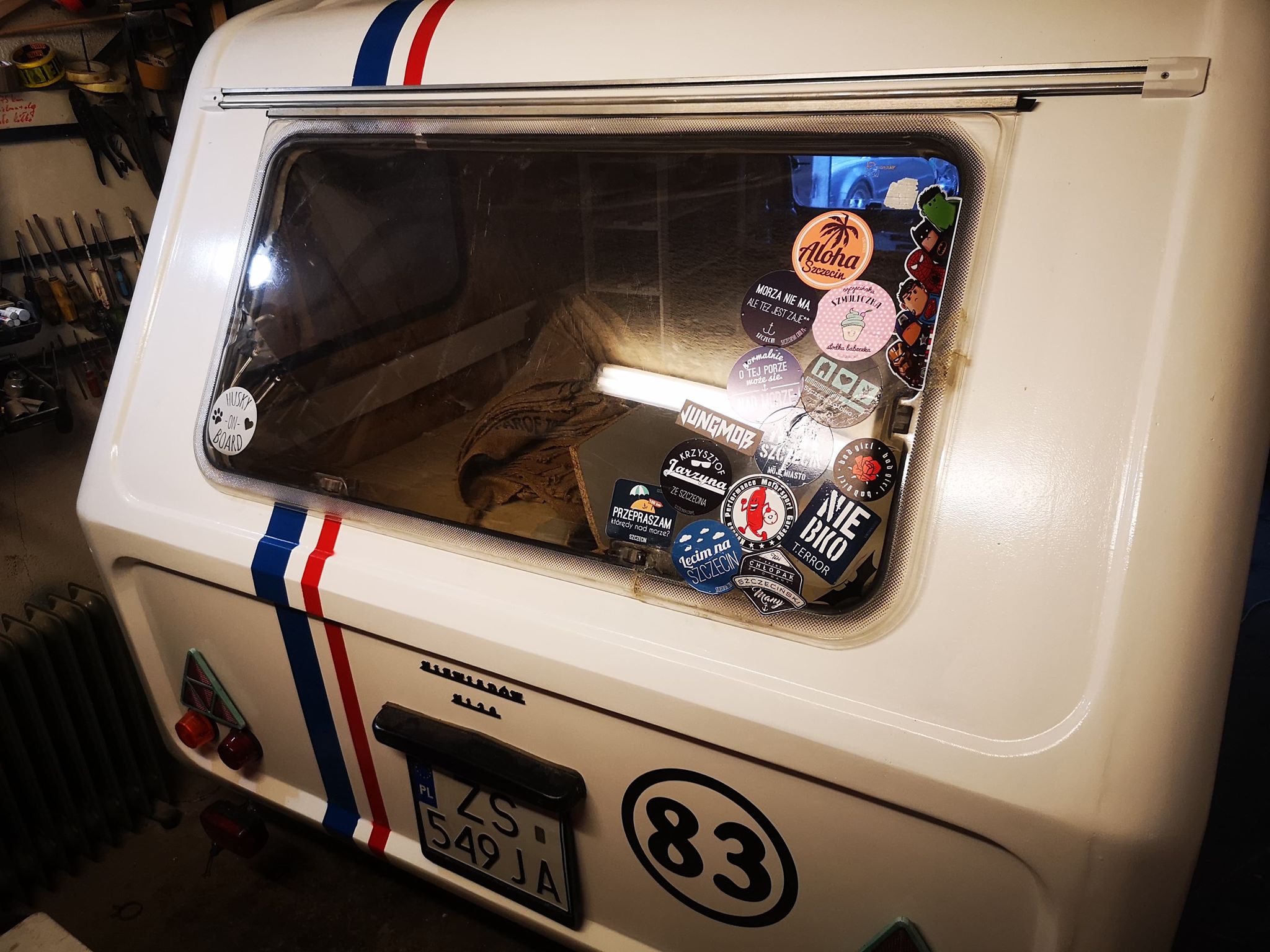 Przez upały chwilowo stoję z pracami przy samej przyczepie. Tylko naklejki się tną, a pokrowce i firanki ciocia szyje