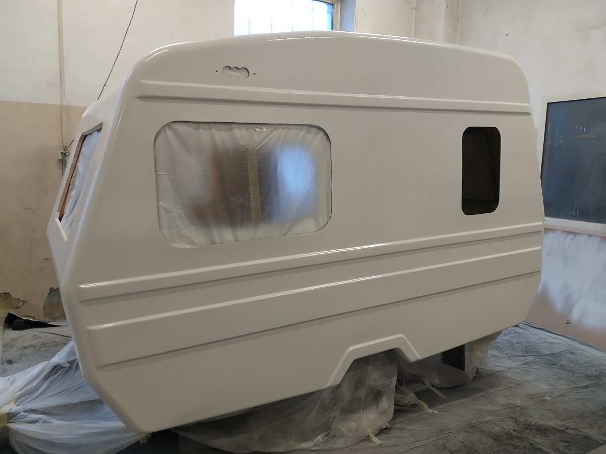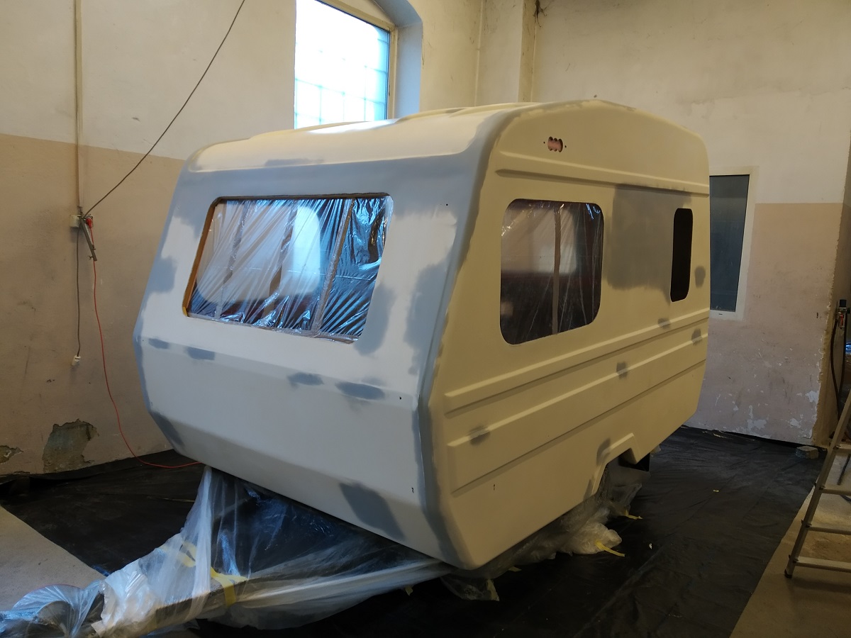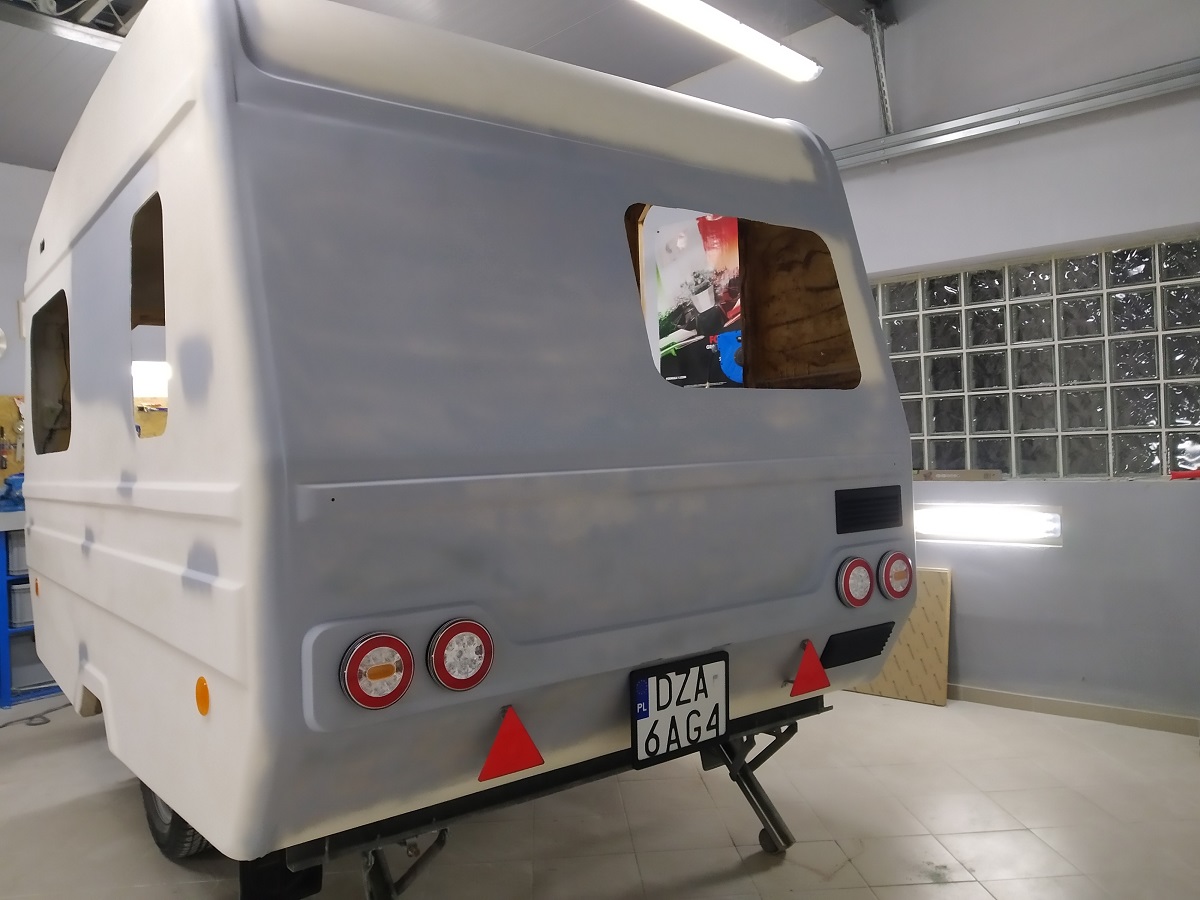 Plan na wczoraj i dzisiaj był taki, żeby wyjść wreszcie ze szpachli i wstępnie prysnąć to epoksydem po szpachlowanych miejscach. Teraz jak przyczepa już nie jest w kolorowe łaty wreszcie widać jak wyglądają miejsca po likwidacji otworów okiennych. Generalnie jestem zadowolony