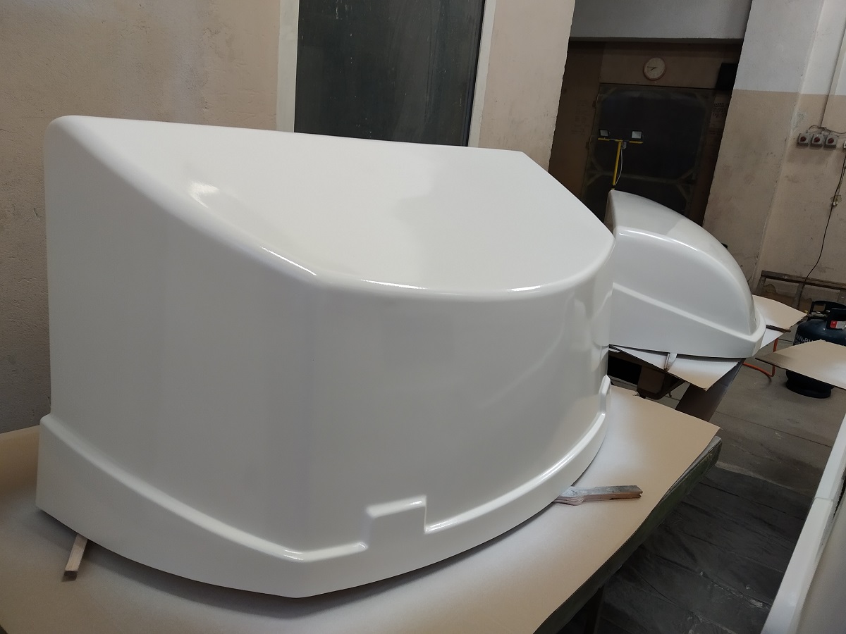Robiłem to przygotowując najpierw arkusz laminatu (żelkot + 2 x mata 450 g), a następnie wycinałem z niego pożądany kształt i wlaminowywałem w otwory okienne (tył oraz okno kuchenne). Wstawione fragmenty od spodu zalaminowałem warstwą tkaniny rowningowej i maty, obie 450 g/m2.