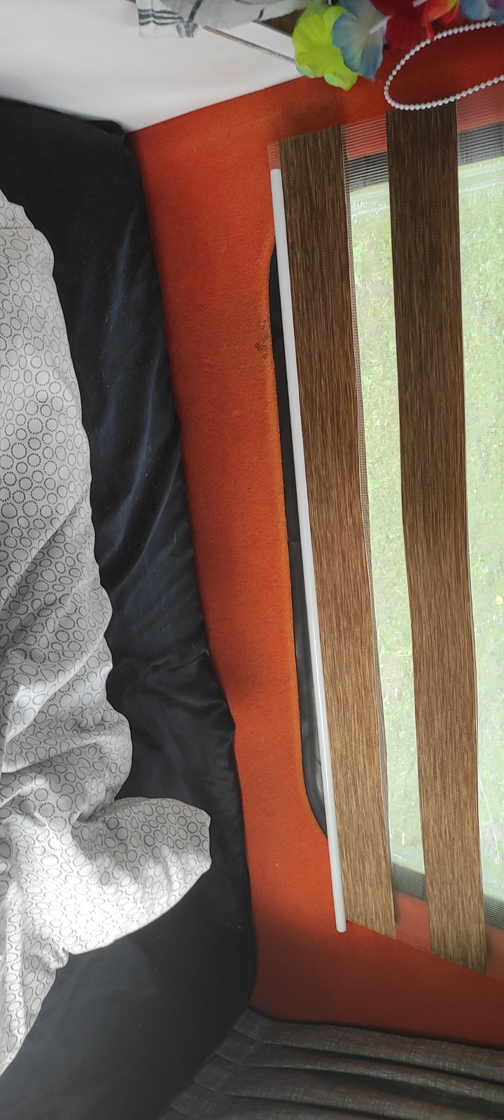 Między szafą a szafką kuchenną mam listwę ze sklejki wysokości 13cm (materac jest na 15zm) właśnie dla tego by materac nie wychodził z poza obrysu stelaża. Mam zawsze rozłożone łózko, bo bo przy moim korzystaniu z przyczepki, nie widzę potrzeby jego składania.
