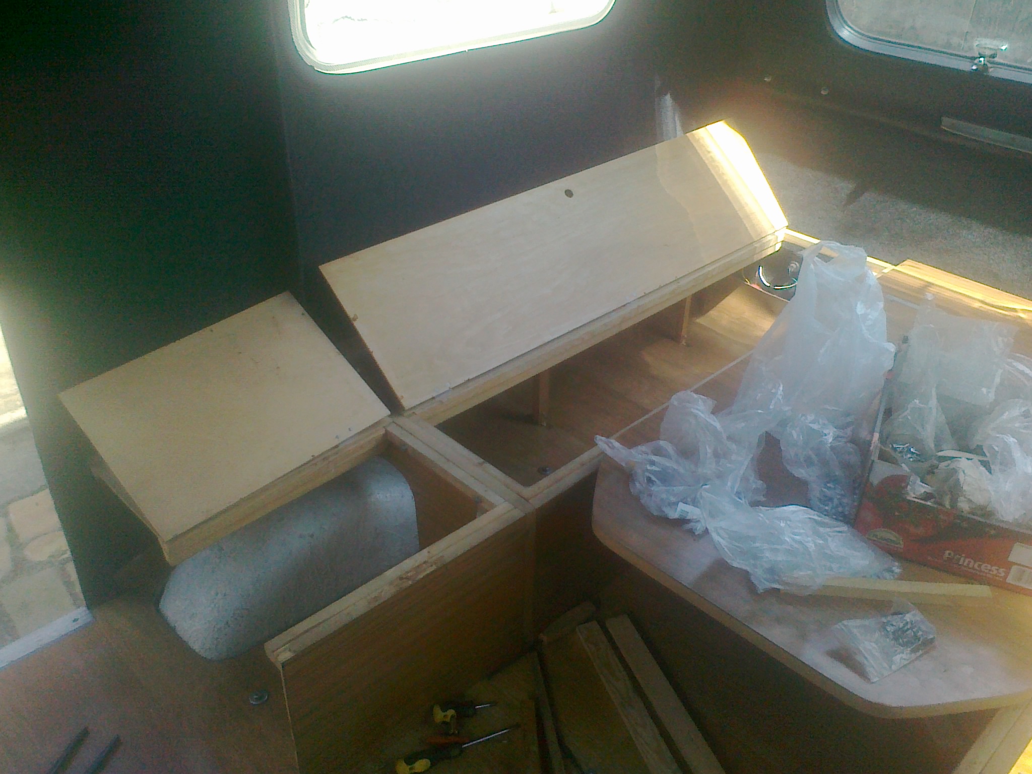 Dzisiejsze prace nad szafką nad zlewem. Półka miała oberwane drzwiczki oraz front więc dorobiłem cały nowy ze sklejki, umocowałem audio. Brak jeszcze okleiny na zamknięciach w kolorze nawiązującym do orginalnych mebli.