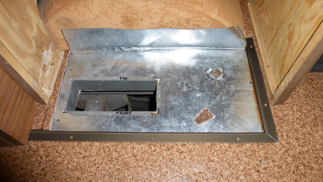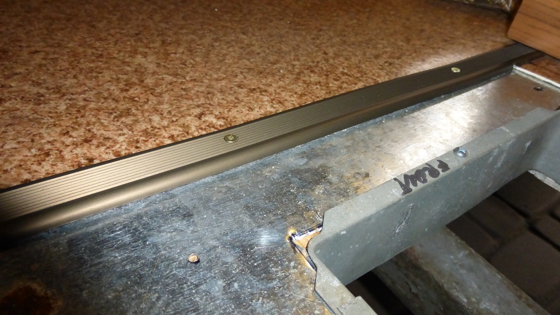 Wracając do pieca, po wycięciu otworu w podłodze sklejkę przykryłem odpowiednio dociętą blachą i wykończyłem krawędzie wykładziny listwą aluminiową. Nie bardzo miałem pomysł jak to wykończyć czyli zrobić przejście z wykładziny do podłogi gdzie stoi piec ale jak dla mnie wyszło całkiem nieźle.