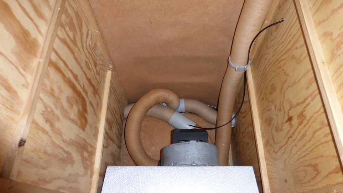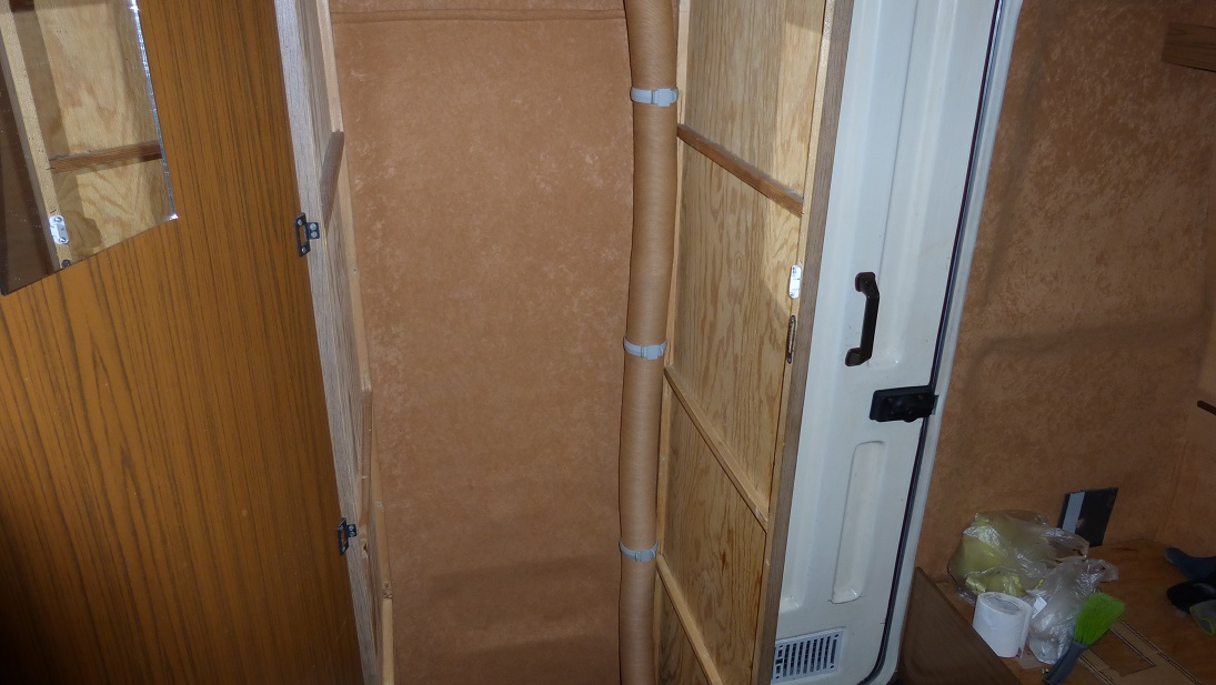 Dwie rury ciepłego powietrza elegancko i bez załamań przechodzą szparą między szafą a bakistą dużego łóżka, nic nie trzeba było ciąć. Górna rura to ogrzewanie przedsionka, widoczne kolanko skręca o 90* i wchodzi bezpośrednio w specjalny wylot-klapę zamontowany na ścianie przyczepy. Niestety zapomniałem zrobić zdjęcie, wstawię później.