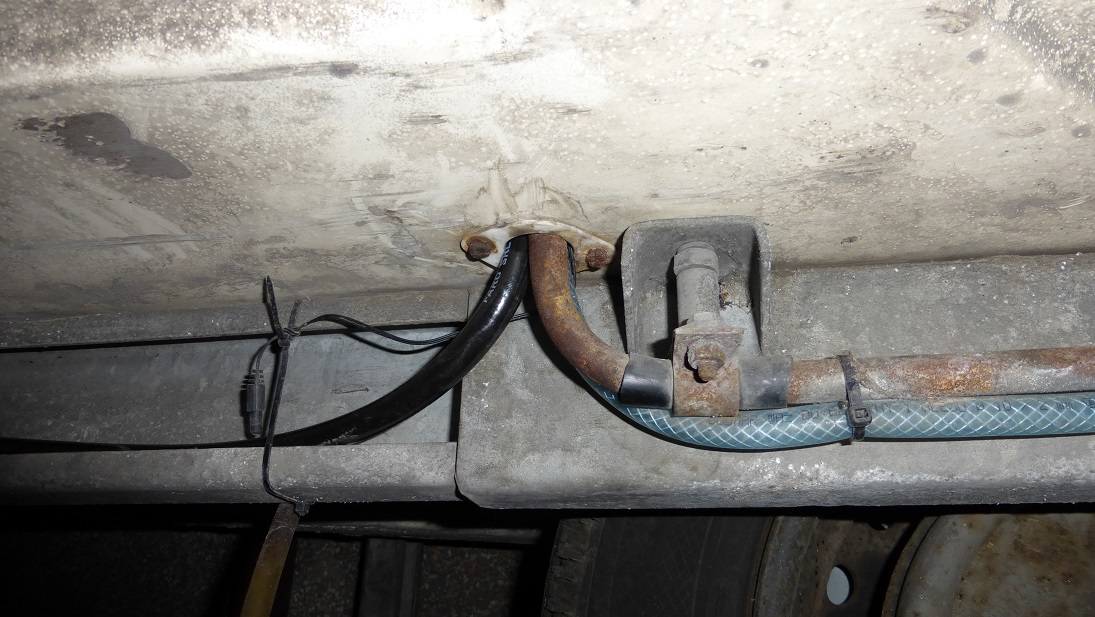 Gaz doprowadziłem do pieca przewodami Faro, które bardzo lubię i miałem już przyjemność układać w samochodach. Na razie zostawiłem oryginalną niewiadowską rurkę gazową, która zasila teraz wielozawór Trumy umiejscowiony w szafce kuchennej, kiedyś zmienię ją na Faro. Na szczęście udało się przeprowadzić Faro przez przelotkę w podłodze razem z rurką wodną i metalową gazową, obyło się bez wiercenia dodatkowego przejścia. Przewód poprowadziłem na drugą stronę przyczepy wzdłuż profilu do którego mocowany jest kosz na koło zapasowe, po czym wpuściłem go w zamkniętą część ramy, skąd wyszedł przy samym przyłączu pieca. Z trzy metrowego odcinka przewodu odciąłem na końcu może z 8 cm. Przewód mocowany jest do ramy za pomocą plastikowych opasek zaciskowych aby nie dziurawić ocynku.