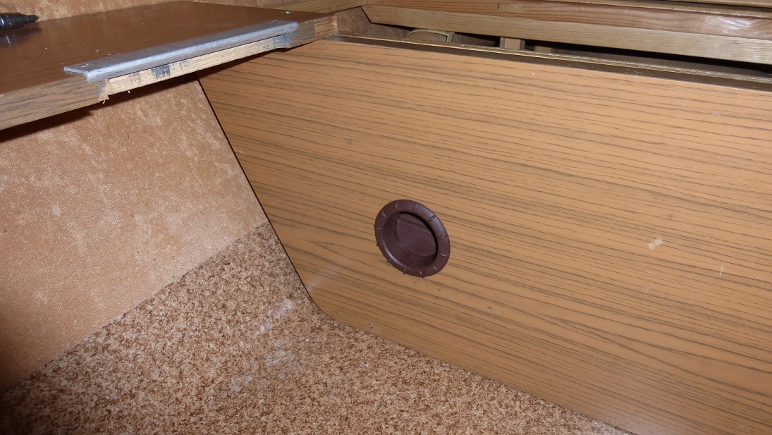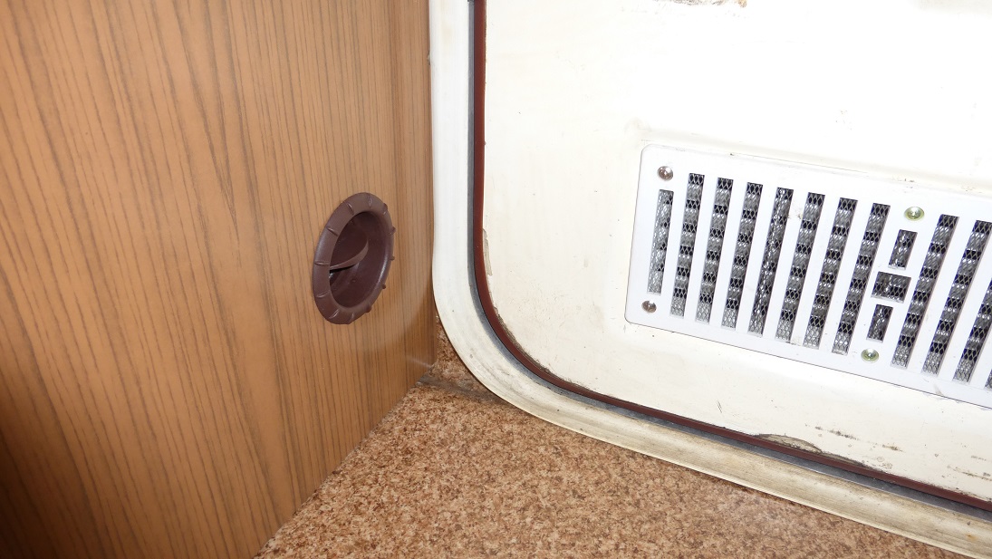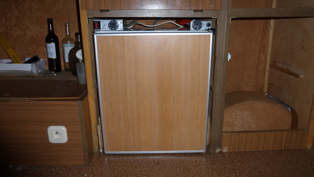 Trzeba będzie dorobić jakiś panel pod pokrętła żeby nie było takiej dziury. Niestety tego elementu nie dostałem z lodówką. Coś się wymyśli, może z tworzywa, zobaczymy. Fajnie, że drzwi lodówki nie wymagają zmiany wyglądu, front całkiem dobrze komponuje się z mebelkami w przyczepie.