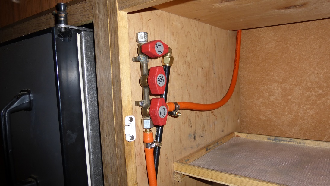 Wspomniany wielozawór jest zamontowany dość wysoko w szafce kuchennej, najwyżej jak się dało żeby nie trzeba było mocno się schylać chcąc otworzyć dopływ gazu do kuchenki. Tego kurka używa się najczęściej, resztę tylko raz na jakiś czas. Wyjście gazu do lodówki na początku zaślepiłem bo w planie robót przed Ciechocinkiem nie znalazła się jej wymiana. Jak to bywa nastąpiła zmiana planów ale o tym będzie później ;)