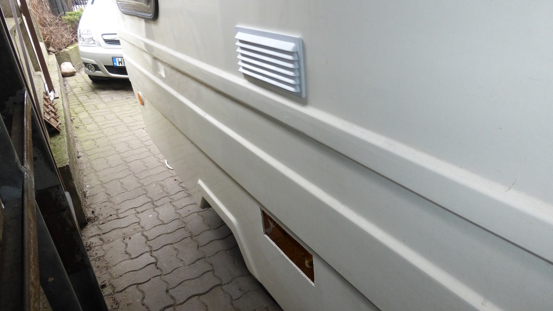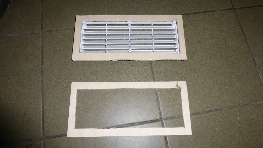 Jedyny problem polega na tym, że przystosowane są do montażu w grubszych elementach, tak jak w drzwiach. Ściana przyczepy jest cienka i aby dało się dobrze skręcić obie części kratki, trzeba było ją pogrubić. Ze sklejki grubości 6 mm wyciąłem dwie ramki i przykleiłem od wewnątrz do ściany.