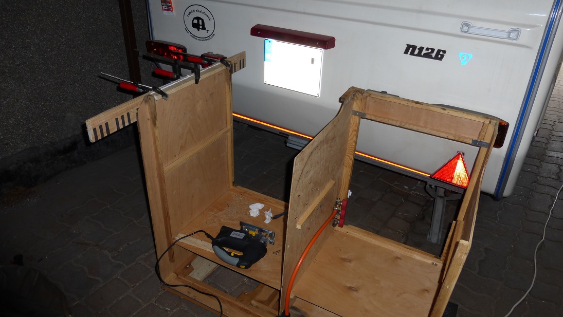 Mam pomysł, żeby zrobić otwory wentylacyjne umożliwiające ucieczkę gorącego powietrza do wnętrza przyczepy. Powinno to być dobre rozwiązanie bo gorąc zamiast kisić się w szafie, rozejdzie się po przyczepie dodatkowo ją ogrzewając. Ale z tym będę się bawił później, na razie dociąłem półeczki i jest gitara :)