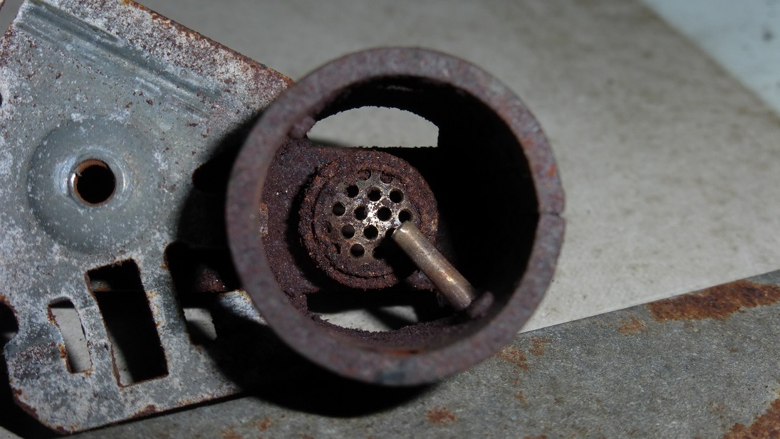 Lodóweczka to stary ale jary Electrolux 12V/230V/gaz. Po podłączeniu do kontaktu chłodził bardzo ładnie natomiast na gazie nie chciał zajarać. To znaczy prychał, kichał i widać było, że coś jest nie tak. Rozebrałem palnik i okazało się, że zasyfiła go rdza. Cała rurka spalinowa była w środku zardzewiała i drobinki po prostu spadały na palnik.