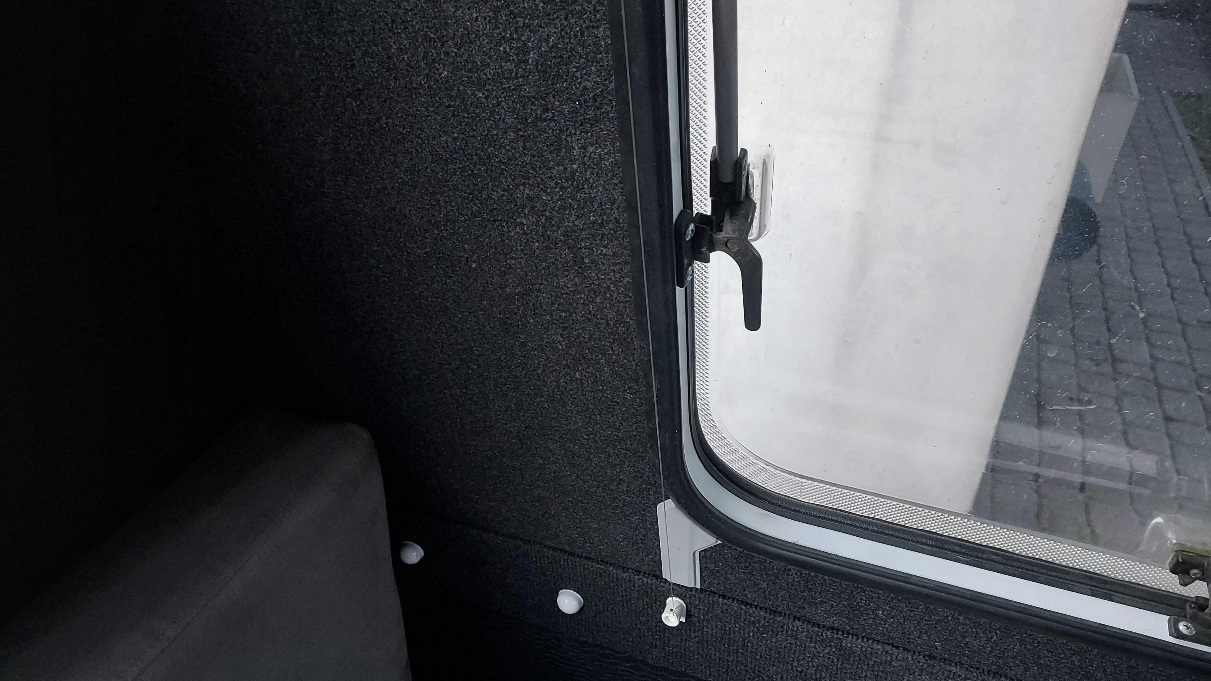No i zauważyłem na ekranie przedniego okna mały zaciek, czyli gdzieś przechodzi woda do wnętrza przyczepy.