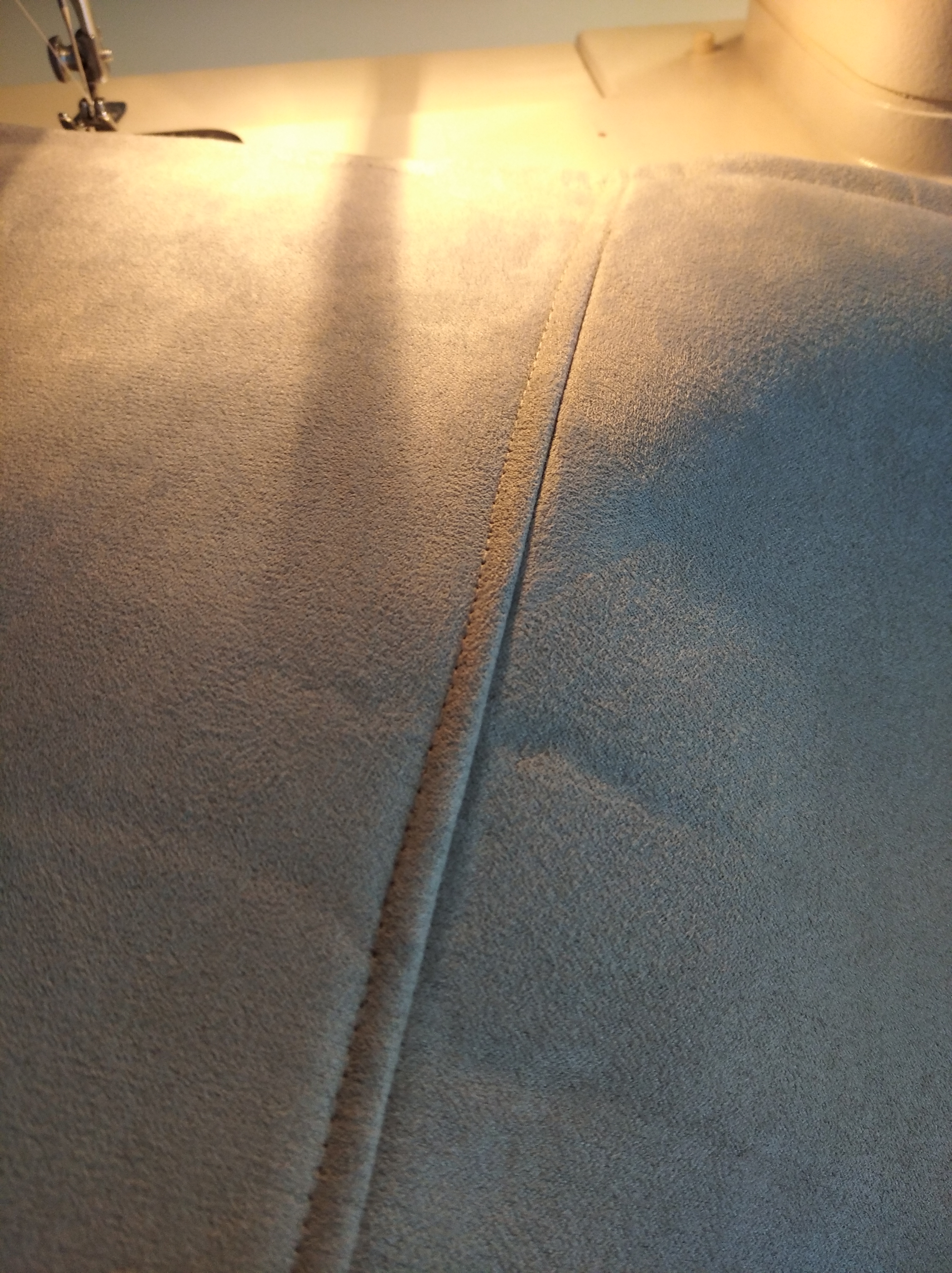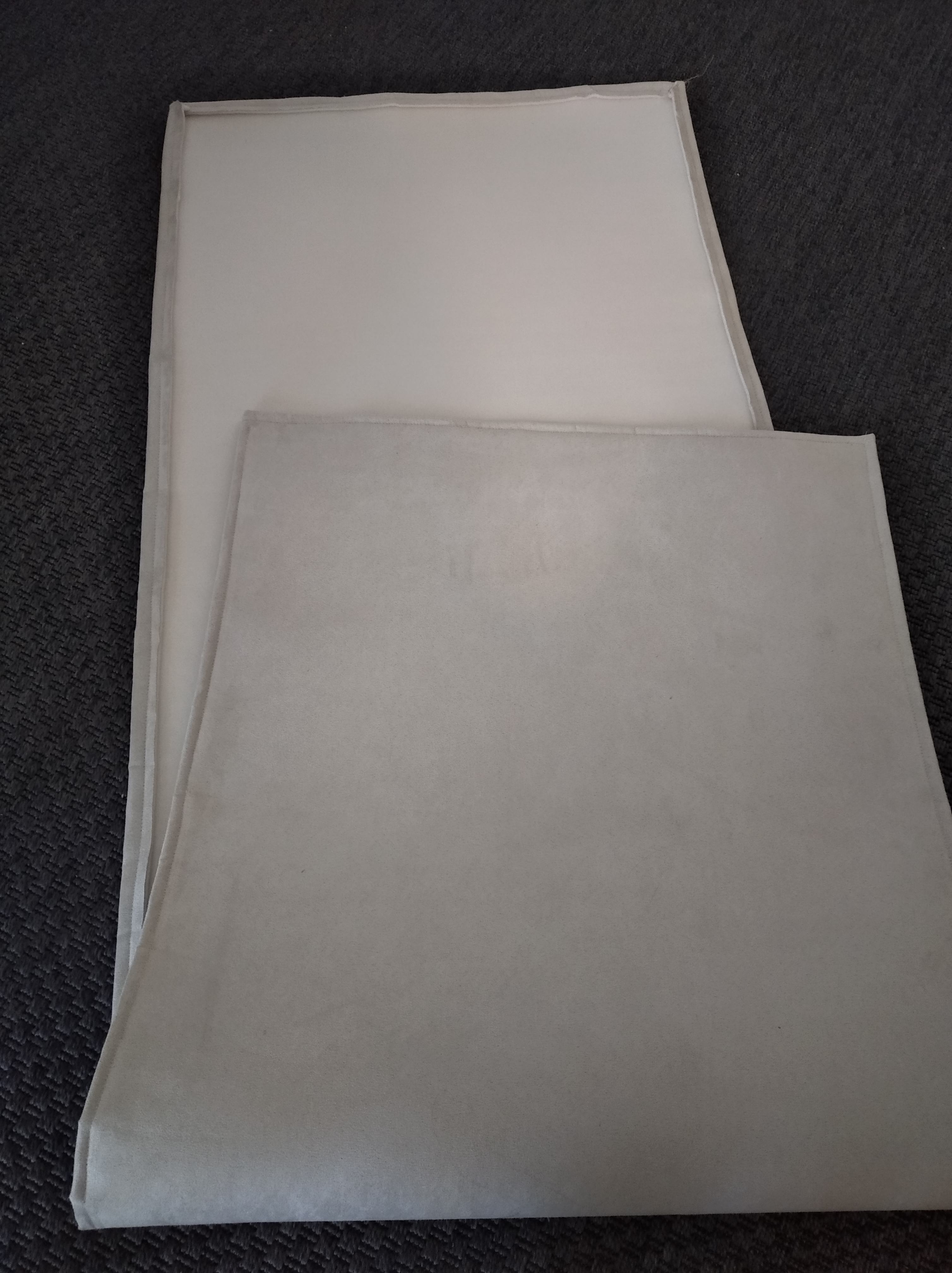 Materiał to sztuczna alcantara, kolor jasny szaro-beżowy.