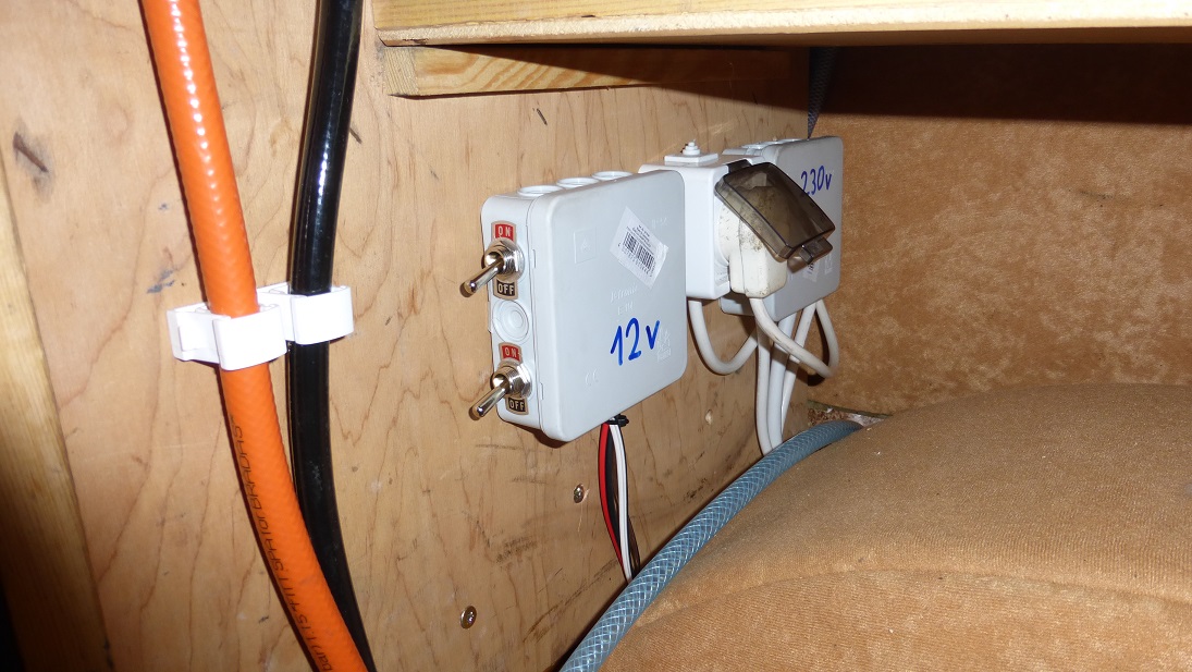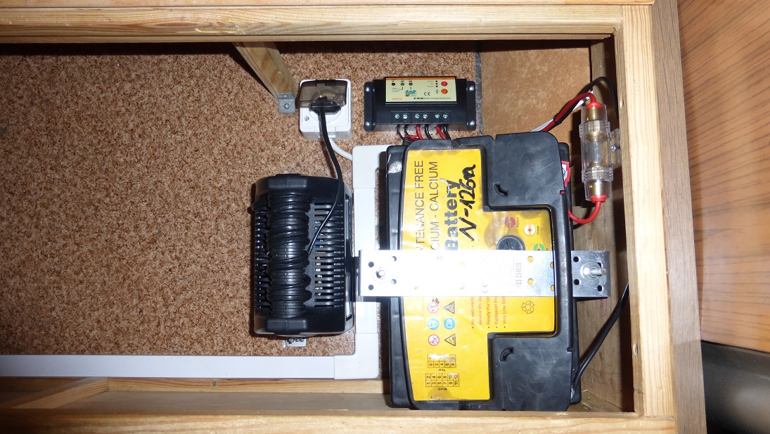 Kabelki poprowadziłem w tunelu elektroinstalacyjnym i wszystko zgrupowałem blisko siebie: akumulator, kontroler i prostownik. Główne przewody zasilania 12V mają przekrój 4 mm2. Takie kable idą od akumulatora przez kontroler i przekaźnik do rozdzielni a stamtąd jeszcze tylko do zewnętrznego gniazda 12V. Również takie same przewody idą od zasilacza do przekaźnika. Dopiero poszczególne obwody wychodzące w rozdzielni mają przewody o mniejszych przekrojach. Tuż przy dodatniej klemie akumulatora jest bezpiecznik 60A, nie wiem czy nie za duży ale innego na tą chwilę nie mieli w sklepie. Na wyjściu z kontrolera i zasilacza dałem na przewodach bezpieczniki 10A, natomiast poszczególne obwody wychodzące z rozdzielni mają swoje bezpieczniki o mniejszych wartościach we wspólnej obudowie. Jeśli chodzi o zewnętrzne gniazdo 230V, dałem przewód 3x2,5 mm2.