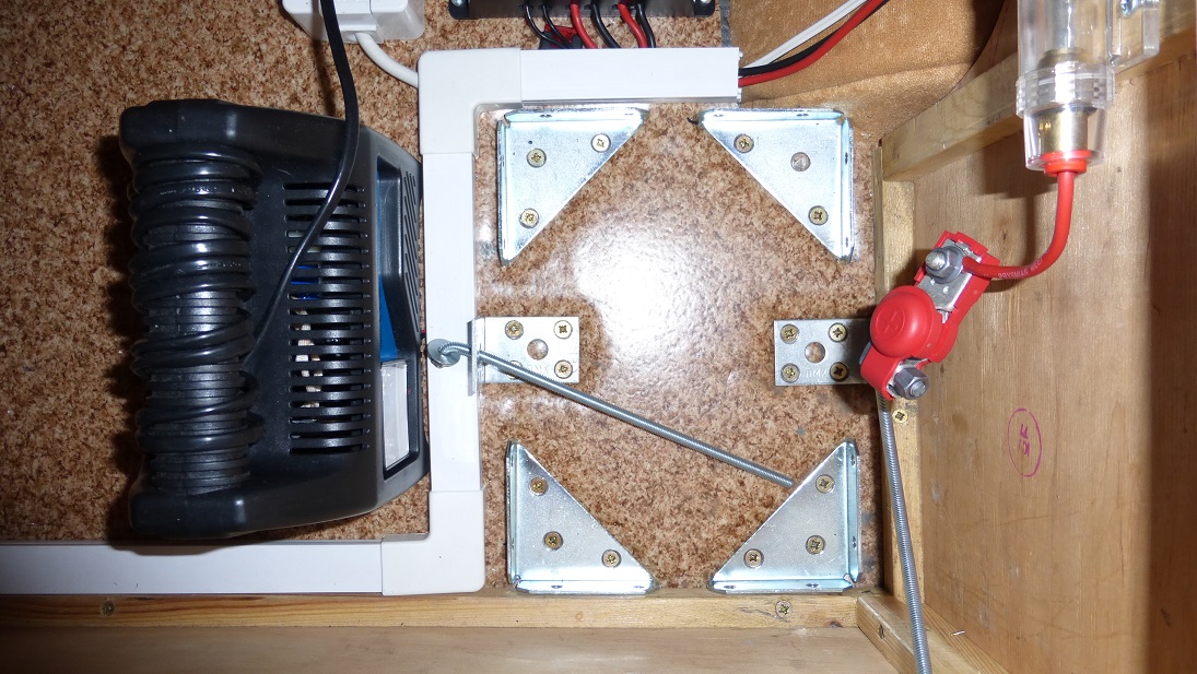 A więc, akumulator wylądował pod dużym łóżkiem, po stronie szafy i przy nadkolu. Zależało mi żeby możliwie zminimalizować wpływ jego ciężaru na nacisk na hak, nawet kosztem przestrzeni w bakiście. Początkowo miał znaleźć się w kufrze na dyszlu ale zmieniłem zdanie. Wygląda to tak: