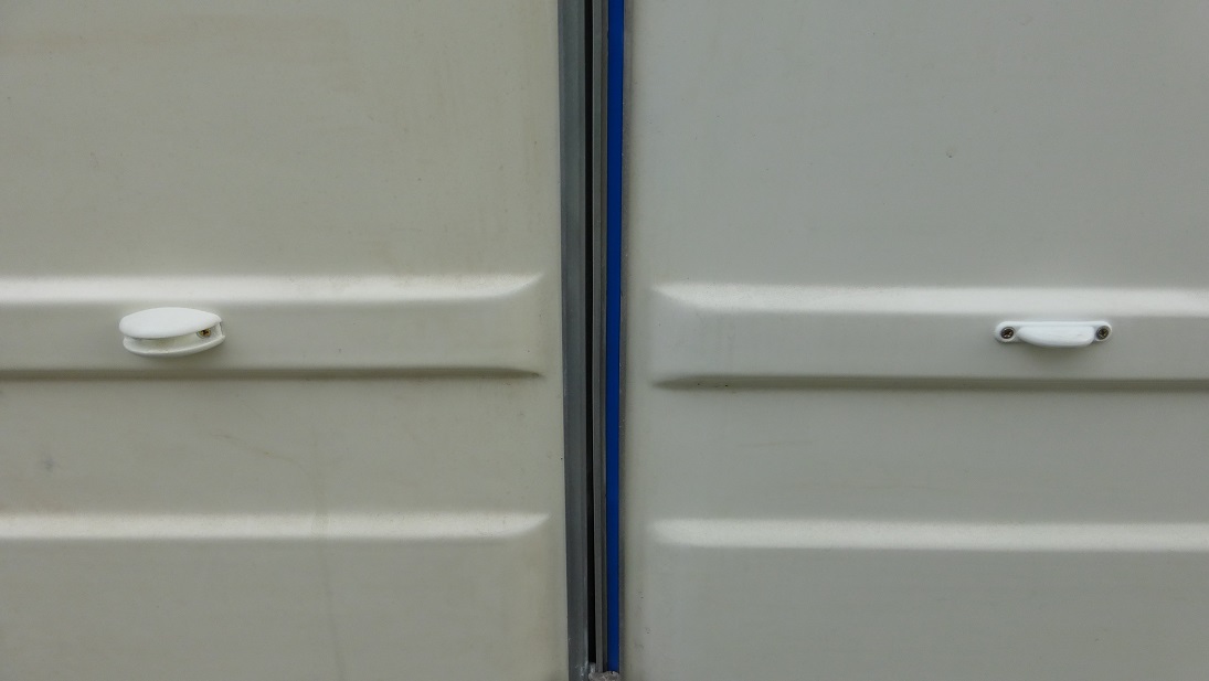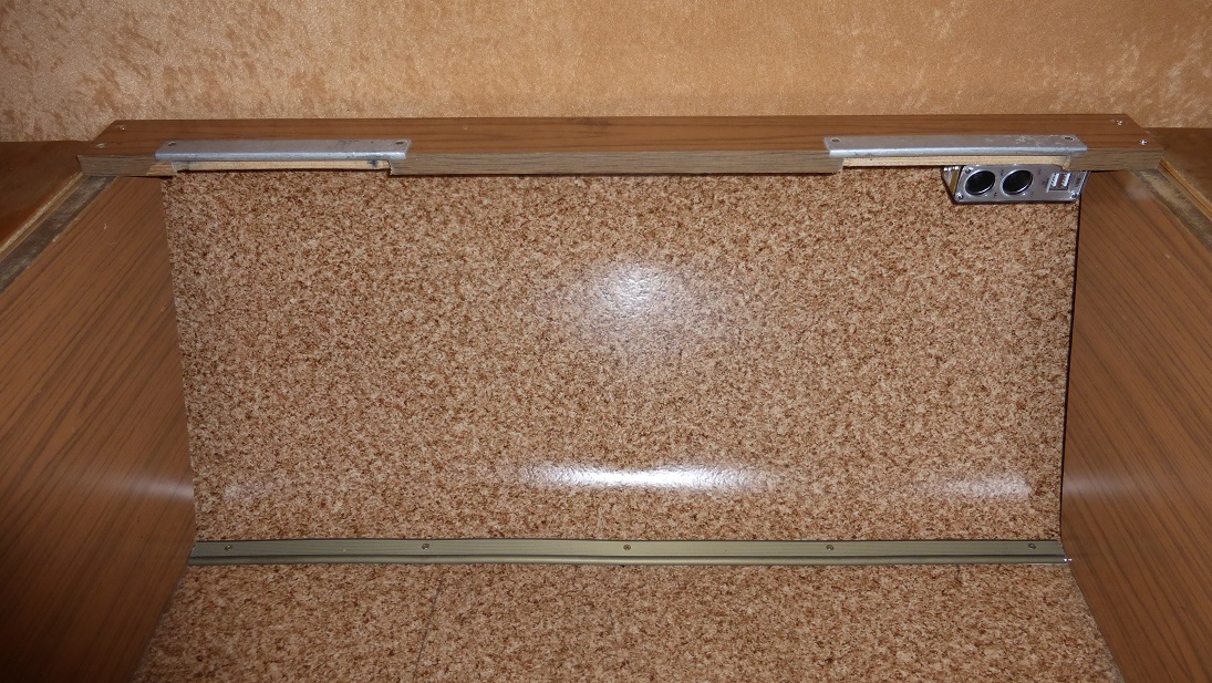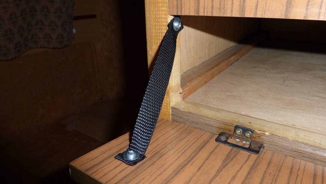 We wnętrzu przyczepy zrobiłem jeszcze jedną ważną rzecz - całkowicie pozbyłem się dwóch ostatnich zamków na klucz, od szuflady i tego schowka nad lodówką :) Założyłem te zameczki-przyciski, które są o niebo wygodniejsze. Poprawiłem szufladę, to znaczy po jej wysunięciu dokleiłem w jej wnęce listewkę żeby nie miała aż takiego luzu na boki. Strasznie to było wkurzające przy jej wsuwaniu. Dorobiłem też prosty ogranicznik w drzwiczkach obok szuflady, które opadały do oporu na dół. Paseczek przykręcony na dwa wkręty, robi robotę: