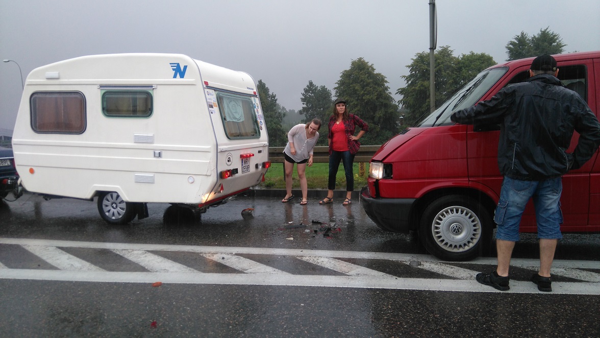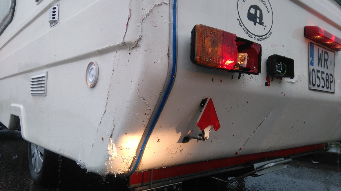 Straty, no to cóż, widać na fotkach. Cały narożnik rozwalony, ściany połamane, bakista połamana. W aucie skrzywiony hak i rozwalony zderzak. Zaczep się nie wypiął tylko wygiął kulę i wlazł w zderzak tak, że nie dało się odpiąć przyczepy. Na szczęście nie ucierpiała rama i dało się normalnie dojechać na kemping.