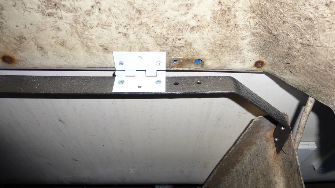 Zrobiłem też bardzo prostą podpórkę klapy, sprawdziła się w 127 więc i tu zrobi robotę. Jest to docięty z długości pręt do podwieszania sufitów zakończony oczkiem. W ściance kufra jest śruba która przechodzi przez oko na końcu drutu dając zawias. Żeby drut nie spadł na końcu śruby nakręcona jest nakrętka z kontrą.