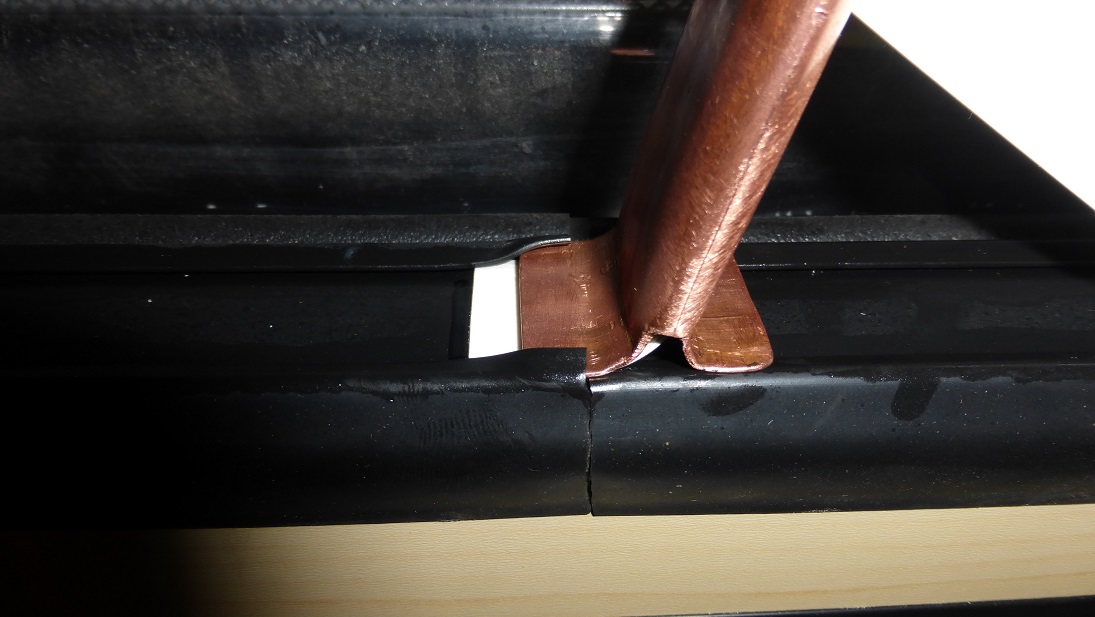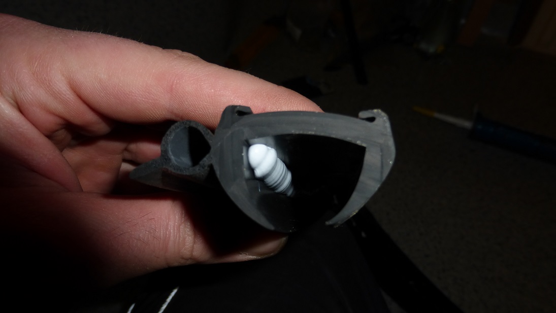 Później u dołu, w miejscu łączenia uszczelki wprowadziłem w nią przyrząd wraz z wystającym początkiem klina. To dlatego, że ciężko jest wcisnąć przyrząd w dowolnym innym miejscu, strasznie pręży.