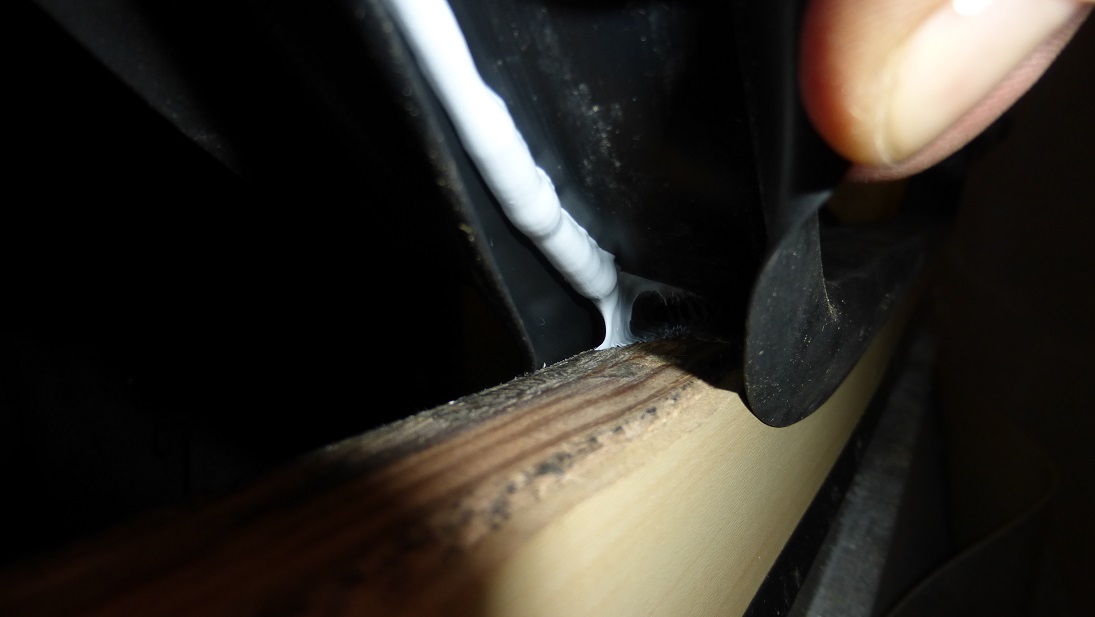 Potem założyłem uszczelki, nówki bo stare były dosłownie kamienne. Montowałem je z użyciem uszczelniacza. Po docięciu odpowiedniej długości odcinka uszczelki (z lekkim zapasem), do wnętrza uszczelki zapodałem uszczelniacz od strony balonika uszczelniającego, czyli tam gdzie wypadnie krawędź laminatu.