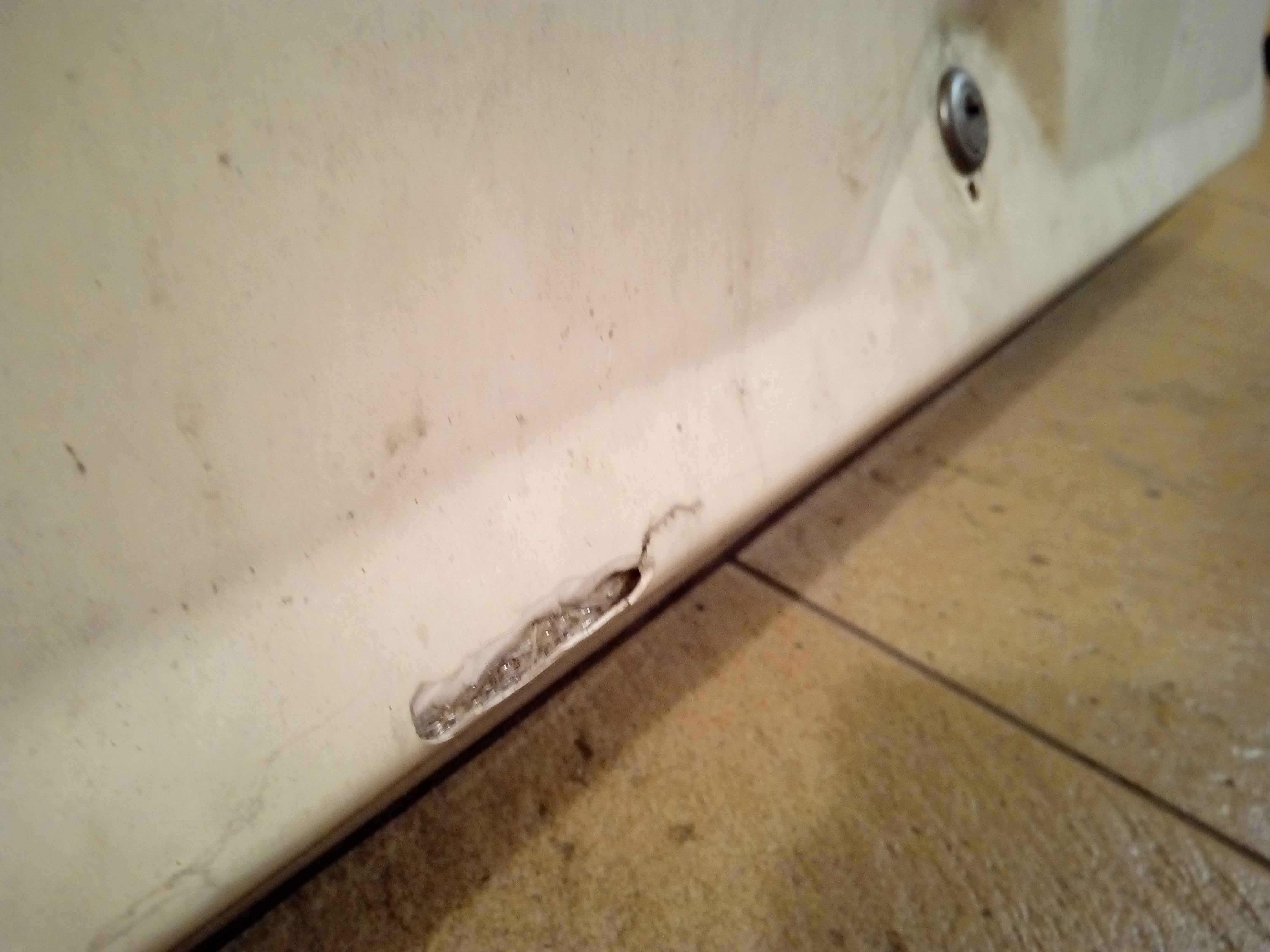 Tragedii ze stanem laminatu nie ma, jest po prostu brudny - jeden duży pajączek z boku, ubytek w dolnej części koło zamka i trochę obtarć (te zejdą po przetarciu papierem ściernym). No, idealnym nie nazwę (ideał dla mnie to coś, co bez jakiejkolwiek ingerencji działa i wygląda), ale i tak się cieszę, bo innych ofert nie było - musi być całościowo pomalowany, bo odstaje kolorystycznie od pomalowanej na biało przyczepy, to się uzupełni przy okazji brakujący laminat. Wkładka działa i zyskała 3 kluczyki.