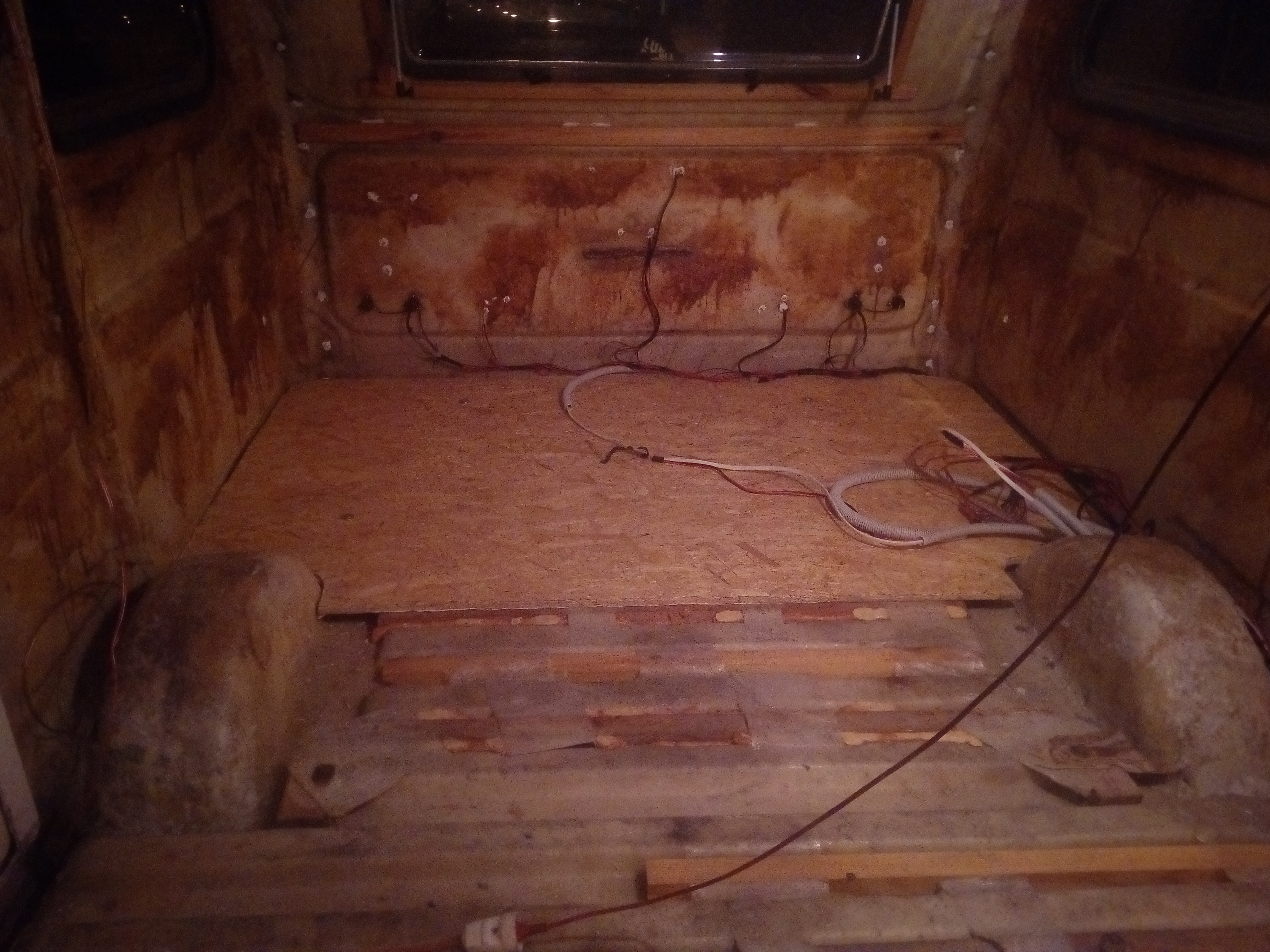 Udało się też zakończyć prace zwięzane z podstawową elektryką, która będzie biegła pod podłogą (problemem może być ewentualny późniejszy dostęp do przewodów, ale coś za coś) - ładne peszelki, taśma izolacyjna samochodowa i "future connection" w postaci oświetlenia kufra na dyszlu i gniazdka 230V pod przyczepą. Teraz podłoga i lecimy z ociepleniem :)