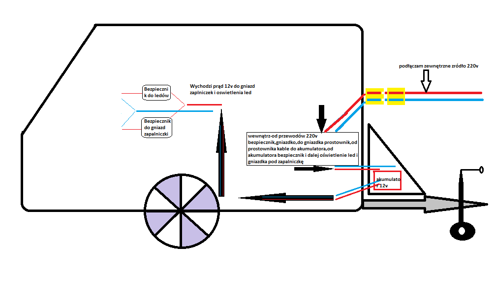 Jestem totalnym laikiem w sprawach prądowych więc proszę się nie śmiać tylko na chłopski rozum mi wytłumaczyć czy tak jak sobie nabazgrałem na rysunku mogę zrobić w przyczepce.Uprzedzam że przeczytałem wszystkie tematy już na forum,bardzo mi się podoba skrzynka Apollo ale ja potrzebuję prostoty żeby samemu tą instalację położyć.