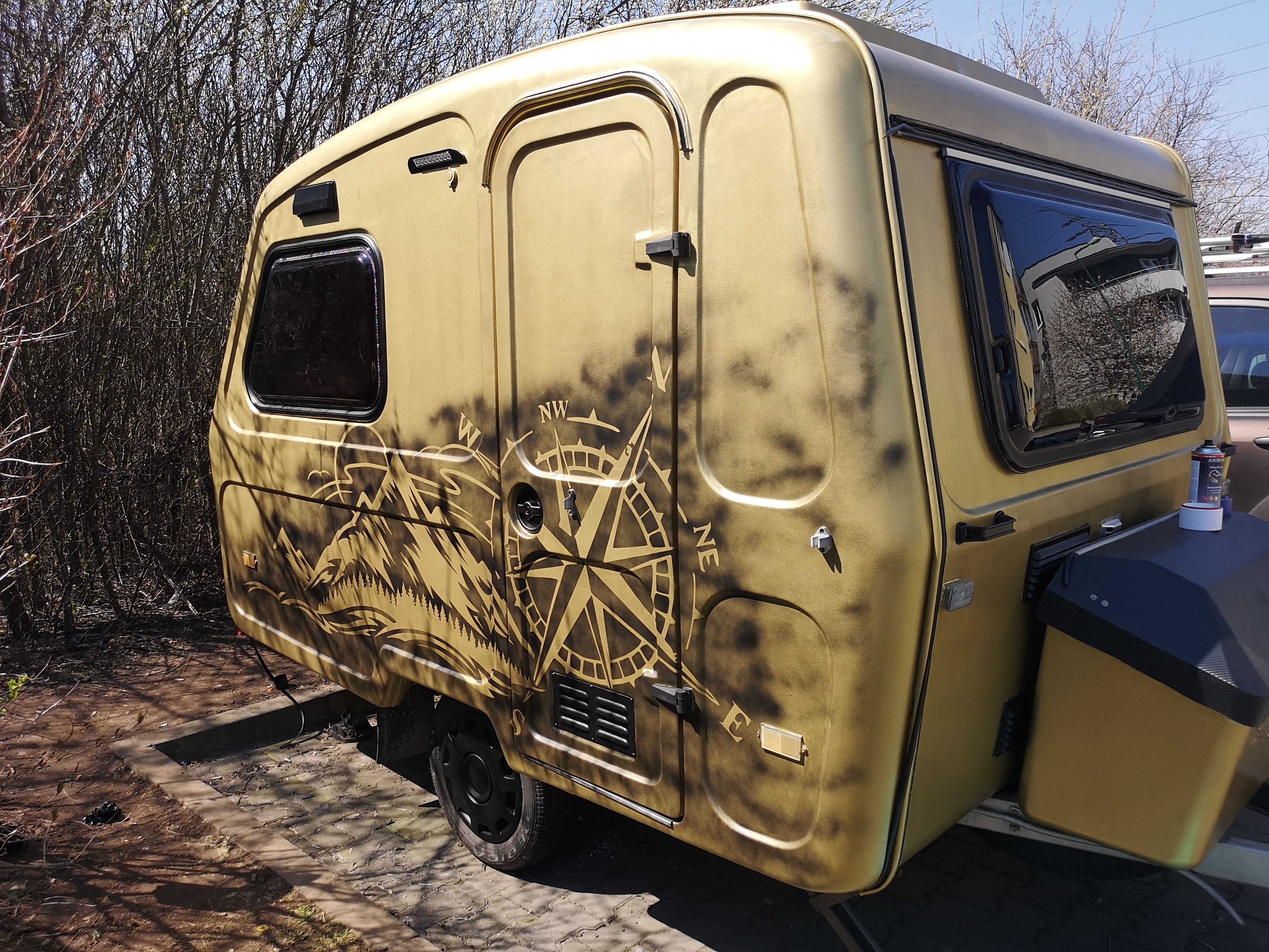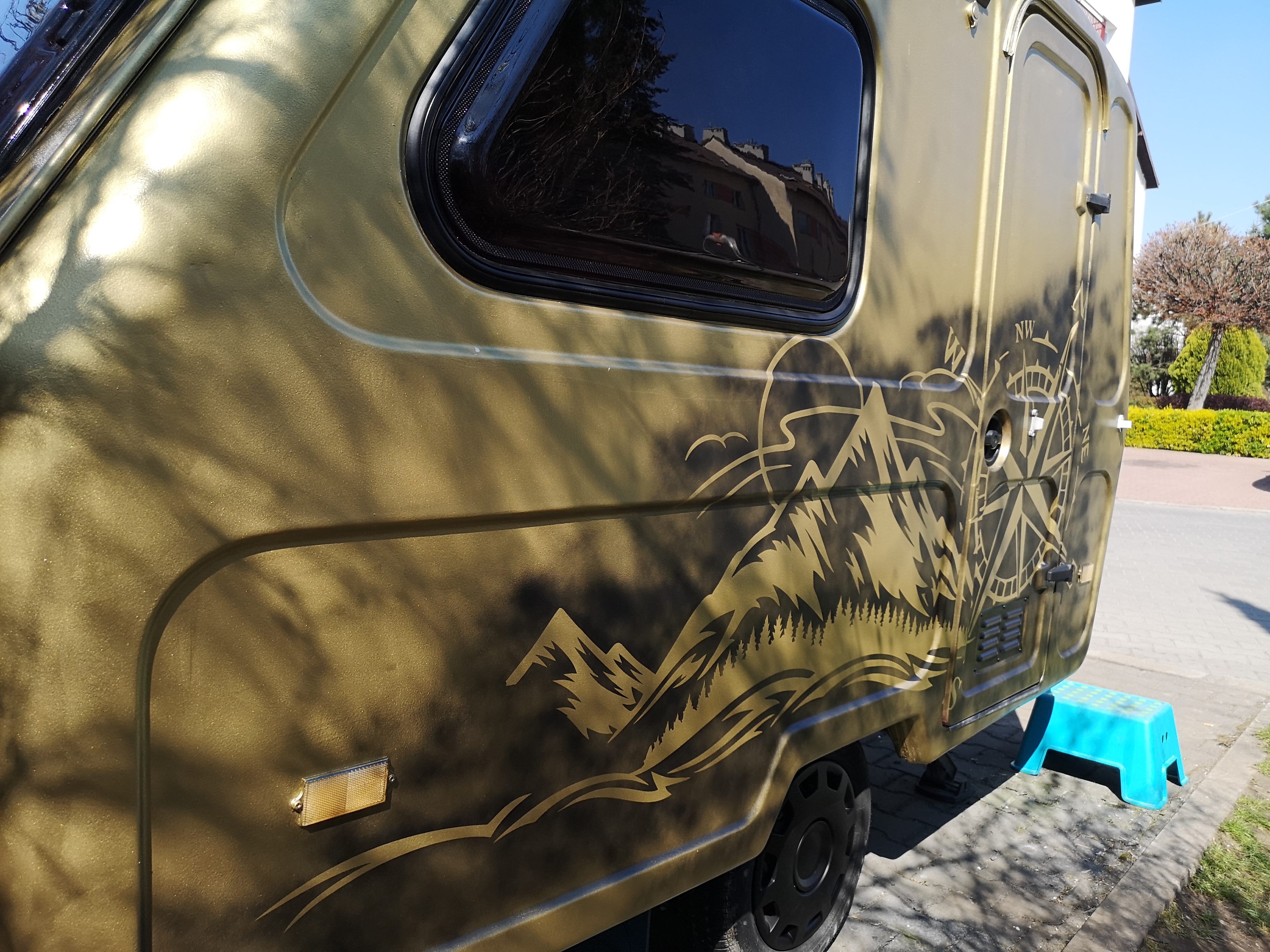 Po 6 latach przyszedł czas na lifting budy. Ze względu na bardzo zmęczone szyby i pewnie jakieś błędy przy pierwszym remoncie zaczęła przeciekać pod obydwoma oknami bocznymi. Zapadła ciężka decyzja - kupujemy komplet okien, szpachlujemy popękane przy włamaniu drzwi i dajemy przyczepie świeży wygląd. Pewnie niektórzy Koledzy mnie wyśmieją, ale w ruch poszła szpachlówka Boll i... Hammerite (!!!) Efekt jak dla nas zadowalający, zobaczymy jak to się utrzyma na skorupie. Kilka przypadkowo spotkanych załóg miało okazję zobaczyć na żywo efekt 40 RBG :)