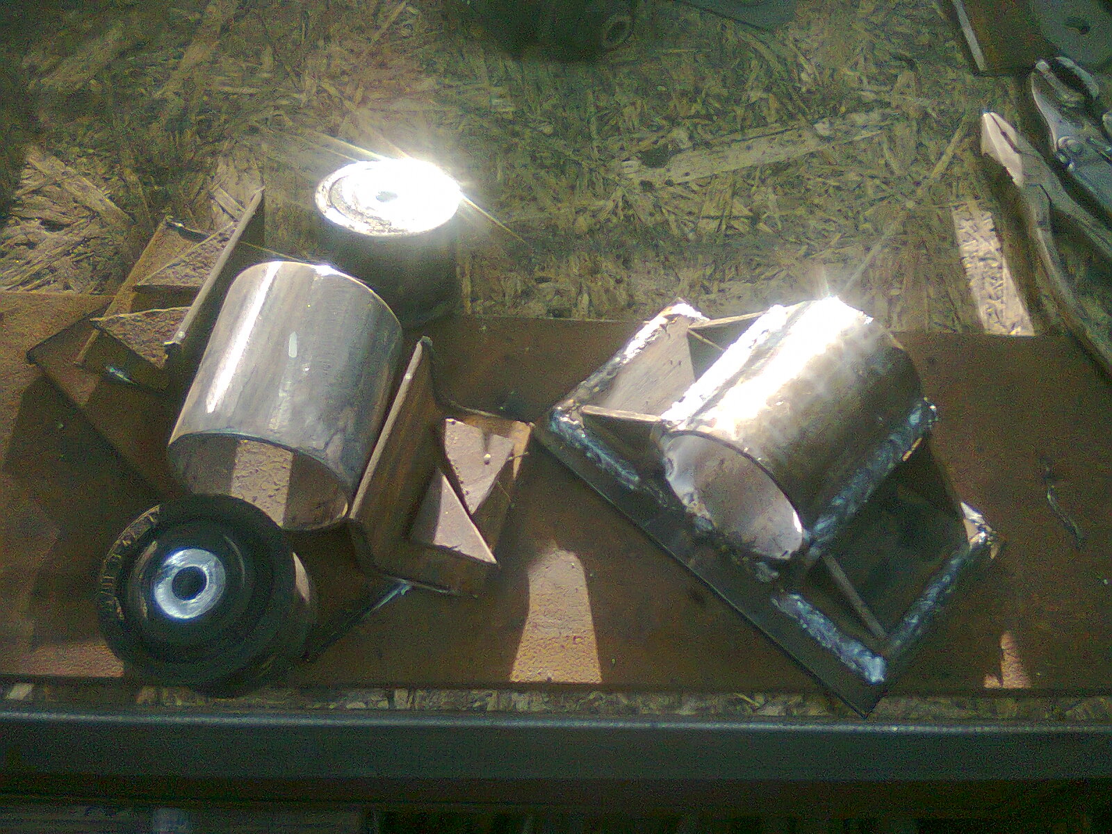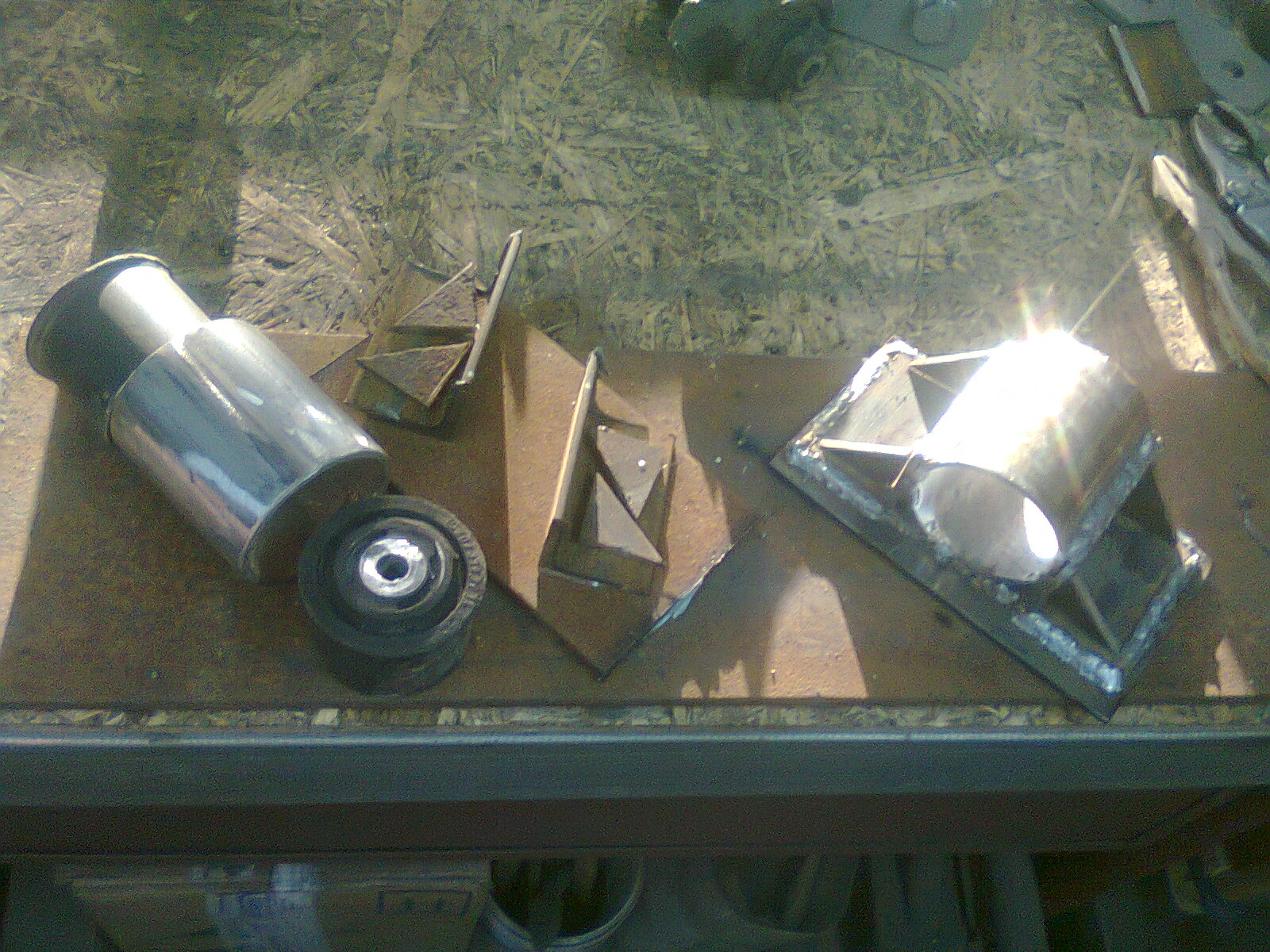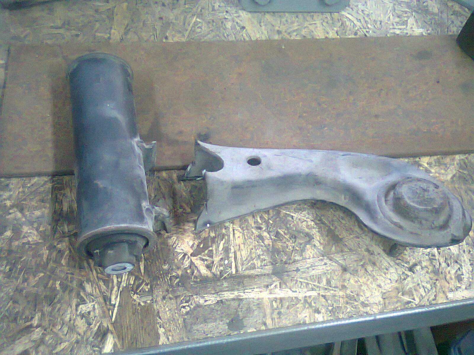 ...ech tak jak kolega dworek wspomniał o tulei to zatem wziąłem wahacze górne z Mercedesa (pozostałości po dachowaniu) i taki oto patent zrobiłem, wiem łatwiej kupić gotowe tuleje, ale gdzie zabawa i tworzenie czegoś z niczego? No i takie stosowne mocowanie zacząłem robić w które będą wprasowane, ale jak na złość skończył mi się drut w migu