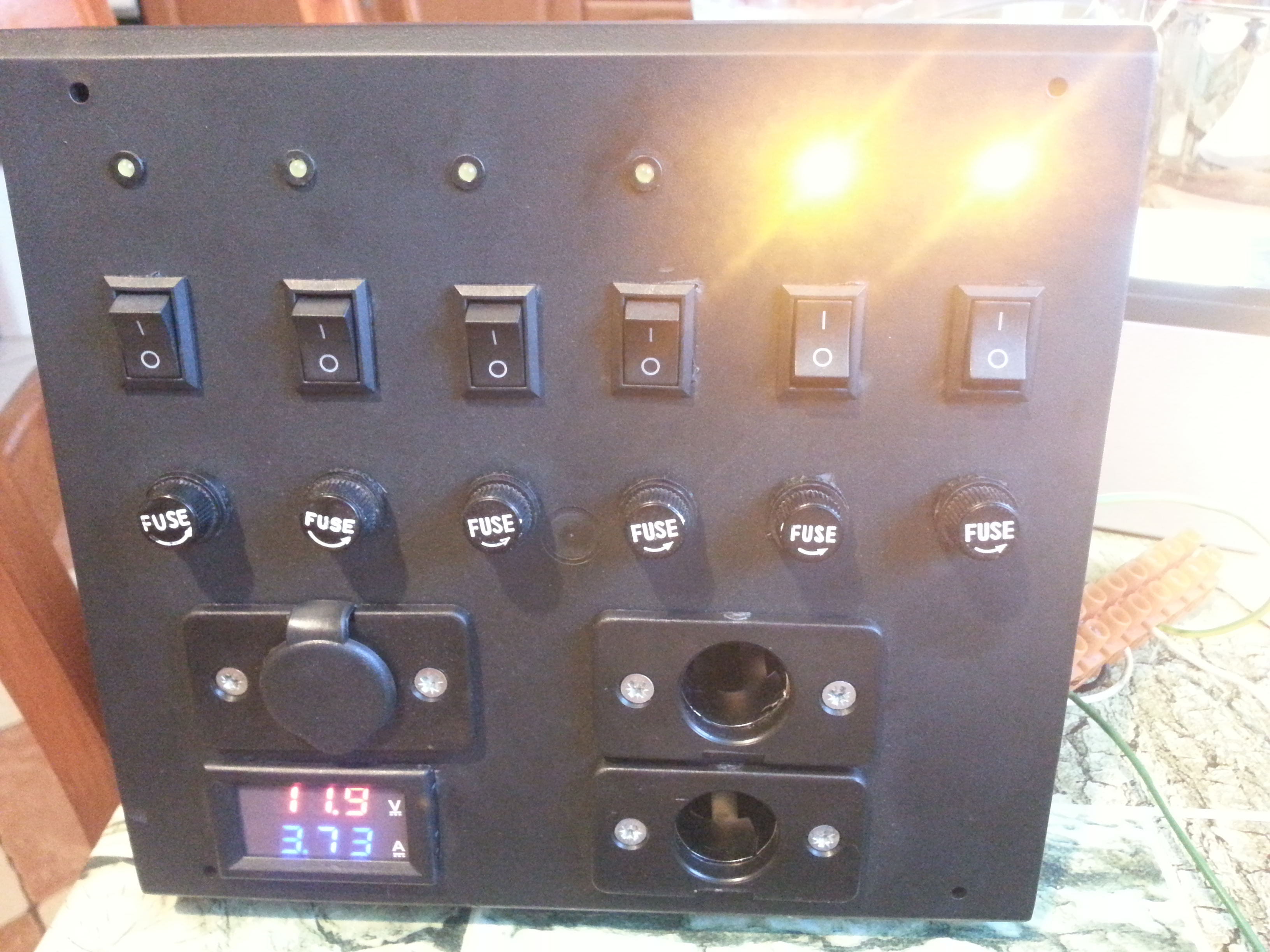 ale wszystkie bezpieczniki, wyłączniki i gniazdka są w jednym miejscu. Mam jeszcze jedną skrzynkę z zasilaczem, przekaźnikiem i przełącznikiem źródła zasilania. Będą 3. Sieć 230V, aku przyczepa i aku samochód. Konsultacji telefonicznych udzielał kolega - elektronik aby to wszystko spiąć do kupy.