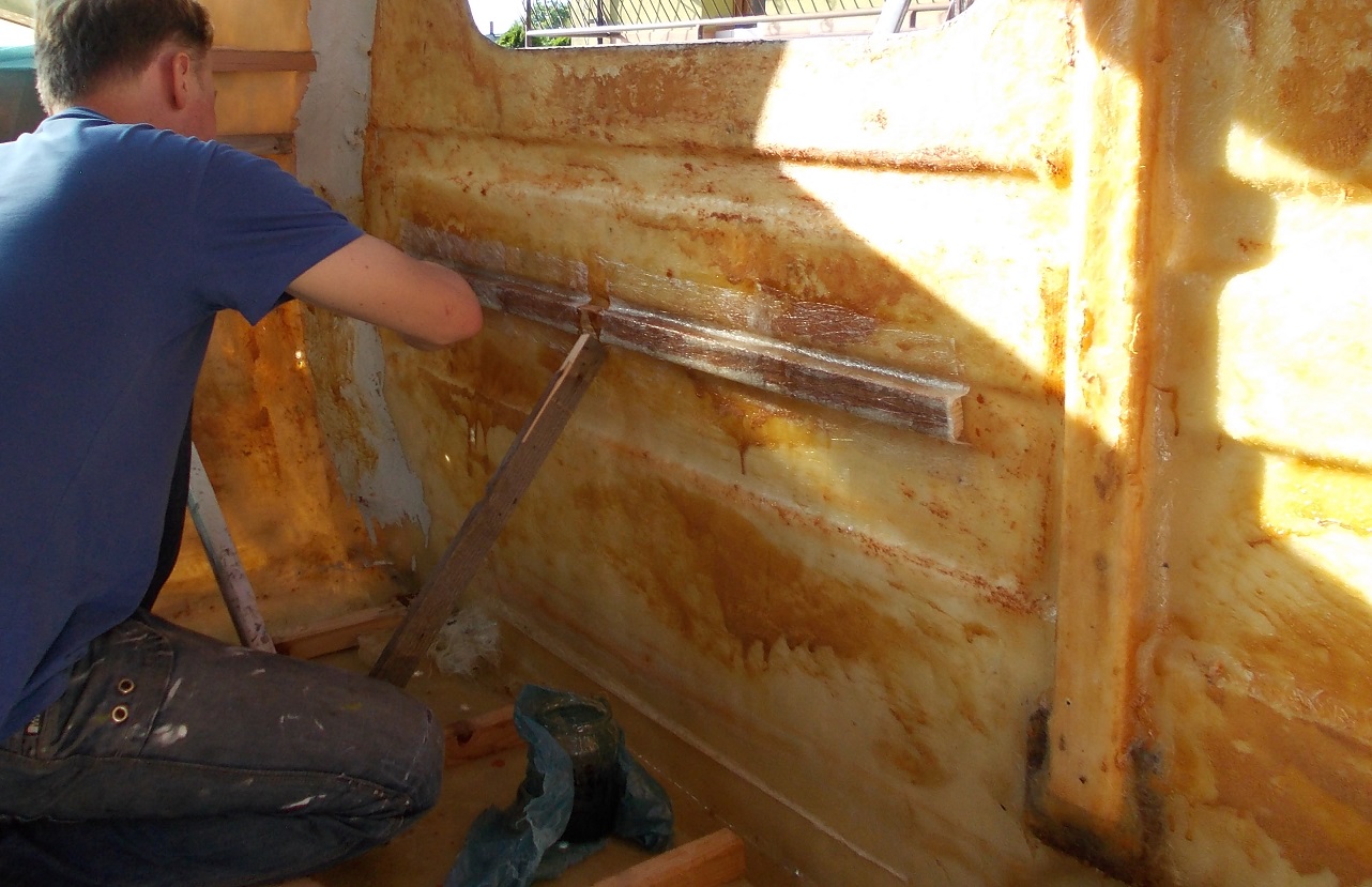 Wymienione 2 listwy nad przednim oknem,wlaminowane deseczki nad bocznymi szybami aby móc przykręcić lampę przedsionka ,czujniki itp. Wlaminowane są również listewki na ścianach bocznych i przedniej które będą częścią łóżka. Wycinając kiedyś otwór pod trumę przeciąłem listwę podłogową ; naprawiłem to dodając poprzeczkę - myślę ze wystarczy.Powiększyłem również ów otwór pod piec bo był trochę przyciasnawy.Cała buda oczyszczona ze starej tapicerki. Śpieszyłem się z laminowaniem bo sprzedawca twierdził że żywica po 15 minutach to beton ale 30 minut spokojnie upłynęło zanim zaczęła twardnieć.