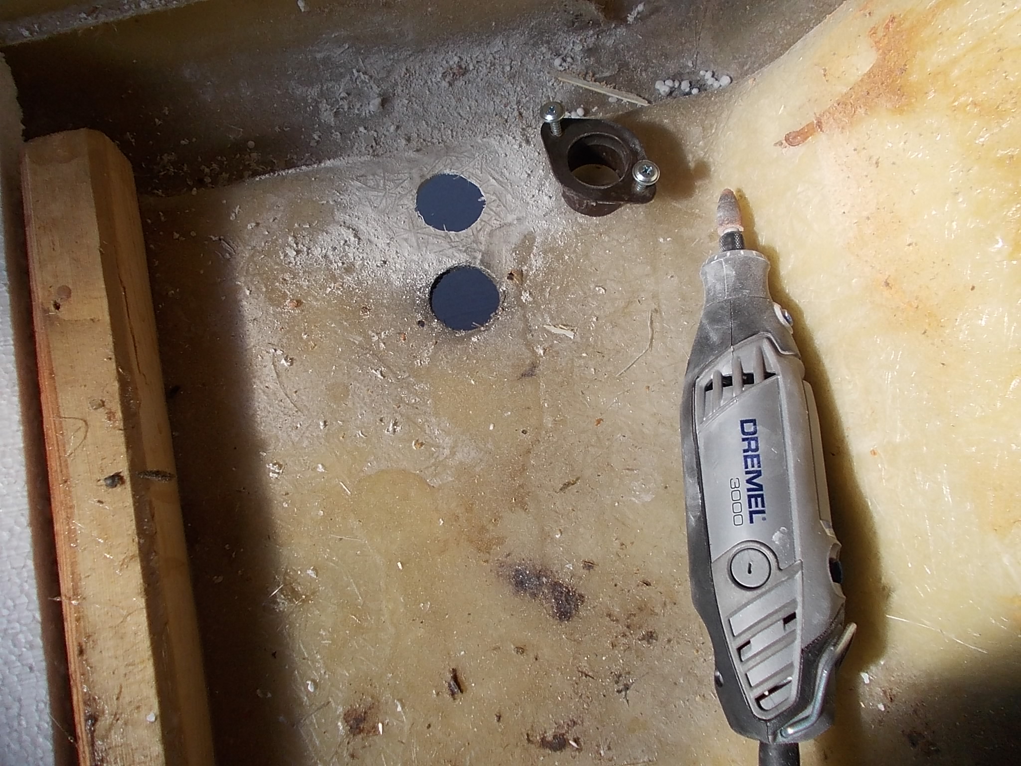 Przesunąłem otwór spustowy szarej bo lodówka o niego wadziła;znów przekonałem się że praca z dremelem to przyjemność - otwory robi się błyskawicznie bez kombinowania.
