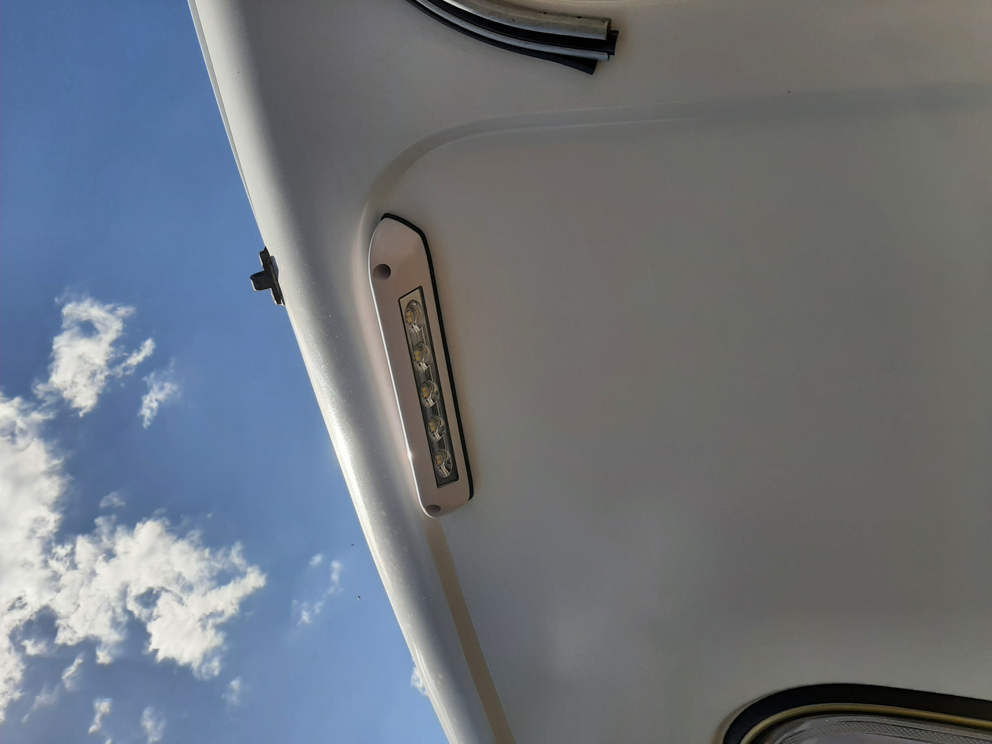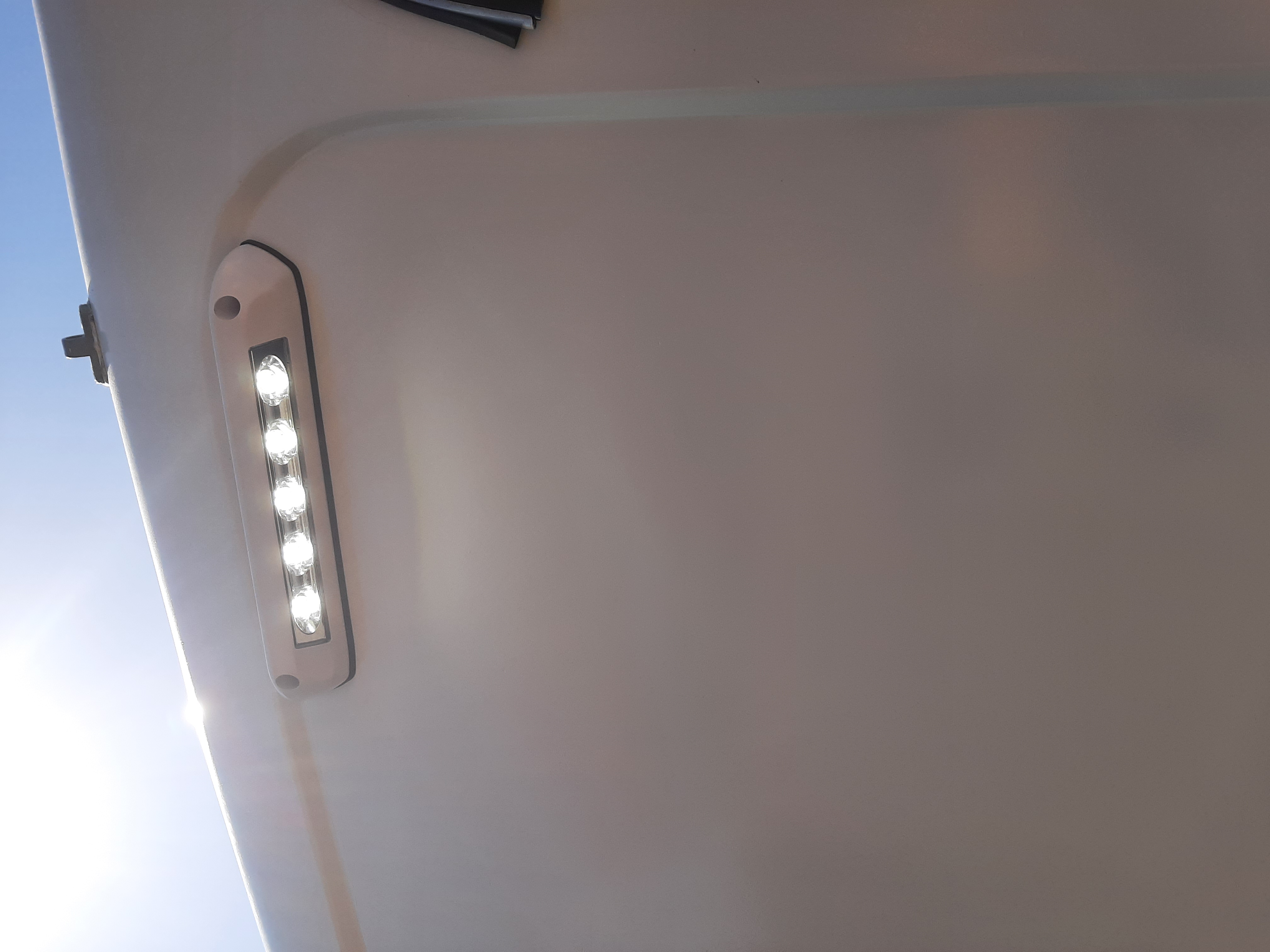 Na zewnątrz przyczepy wpadła nowa lampa. Światło jest dosyć intensywne, więc do nocnych nasiadówek średnio się nadaje, dlatego nie rezygnuję z dotychczasowej przenośnej wersji, którą wieszaliśmy na kalenicy przedsionka/daszka.