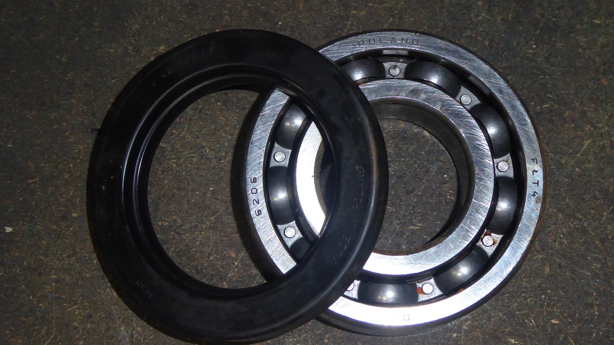 Zdjęliśmy bębny aby dostać się do łożysk. Wstyd się przyznać ale nigdy tam nie zaglądaliśmy. Nie wiedzieliśmy czego się spodziewać. Poprzedni właściciel twierdził, że regularnie tam zaglądał i smarował. Okazało się, że siedzą prawdopodobnie jeszcze oryginalne łożyska. Kulkowe FŁT otwarte, bez krycia. Były już zużyte, pobawiłem się nimi po zdjęciu.