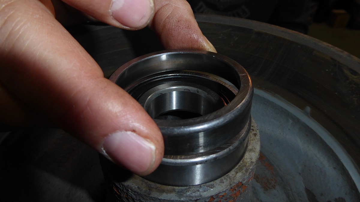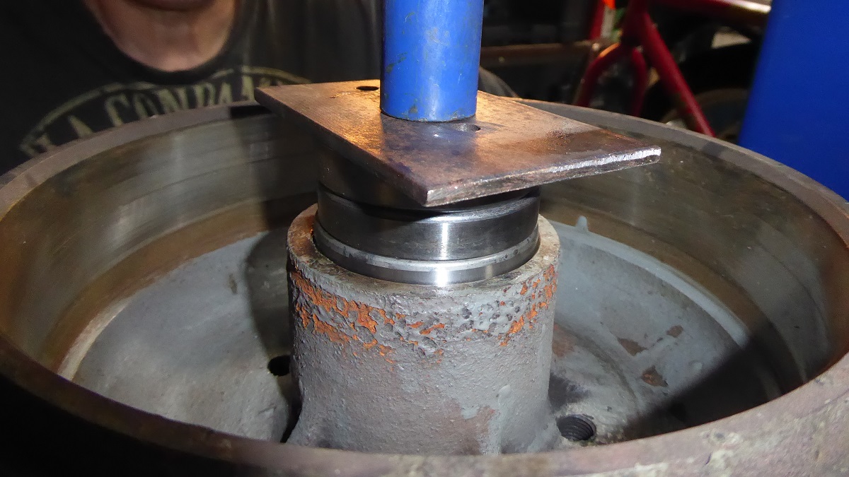 Nowe łożyska wstawiłem przy pomocy prasy i zewnętrznej bieżni łożyska stożkowego, zresztą zdjętego z mojego wieloryba.