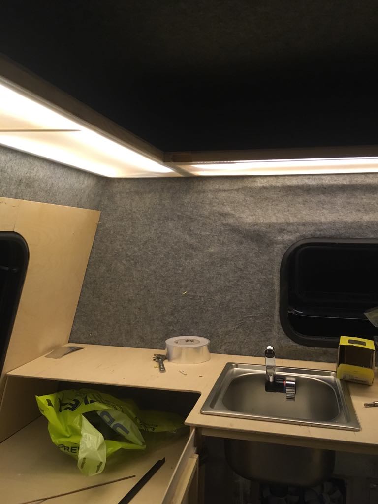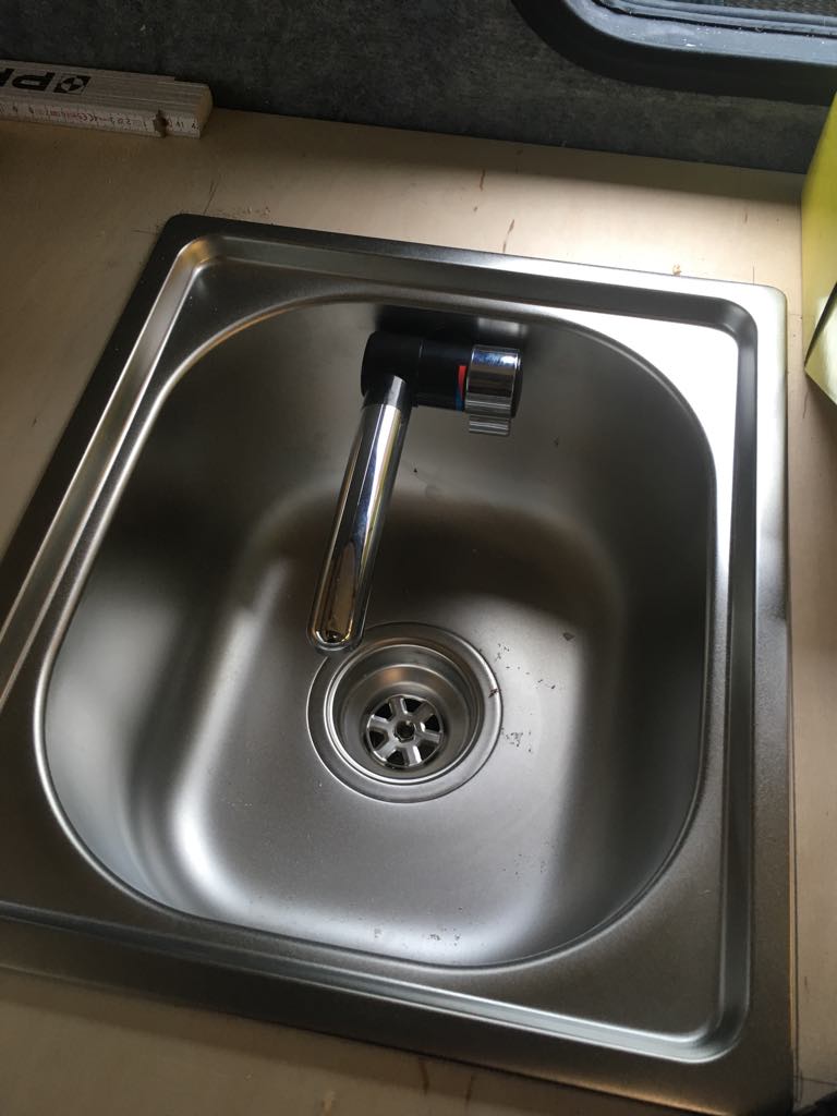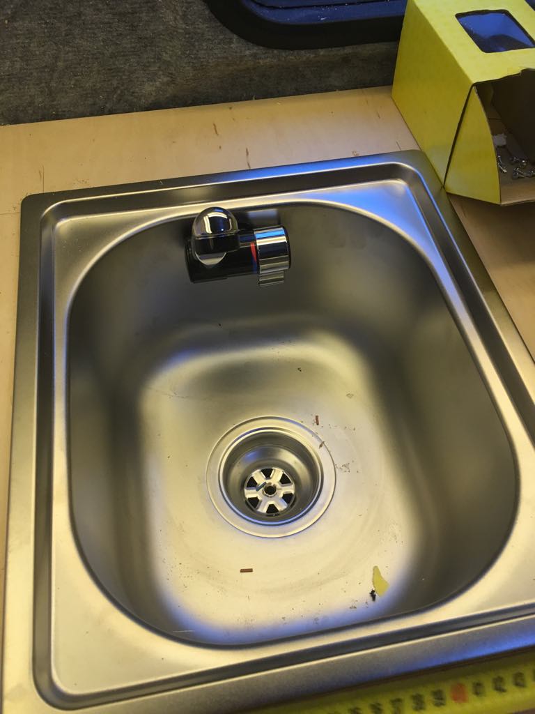 Na dzień dobry, udało się zamontować kran w zlewie. Wylewka została zamontowana w bocznej ścianie aby dało się ją całkowicie schować. W planach mam zrobienie deski dopasowanej do kształtu zlewozmywaka.