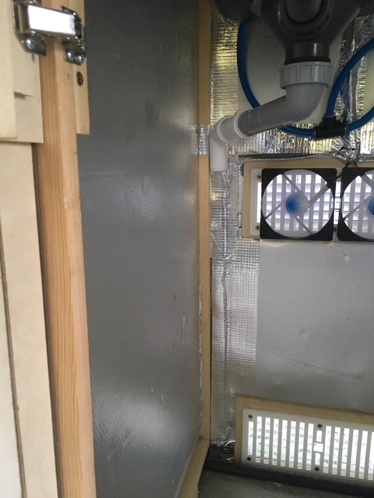 Zastanawiam się też jak spuścić ścieki:) idąć w lewym rogu prosto w dół rura musiałaby przechodzić przez sam rant przyczepy (w zanaczonym miejscu). Nie mogę odsunąć się od ściany, ponieważ wtedy rura będzie za blisko lodówki. Macie jakieś porady jak to rozwiązać.