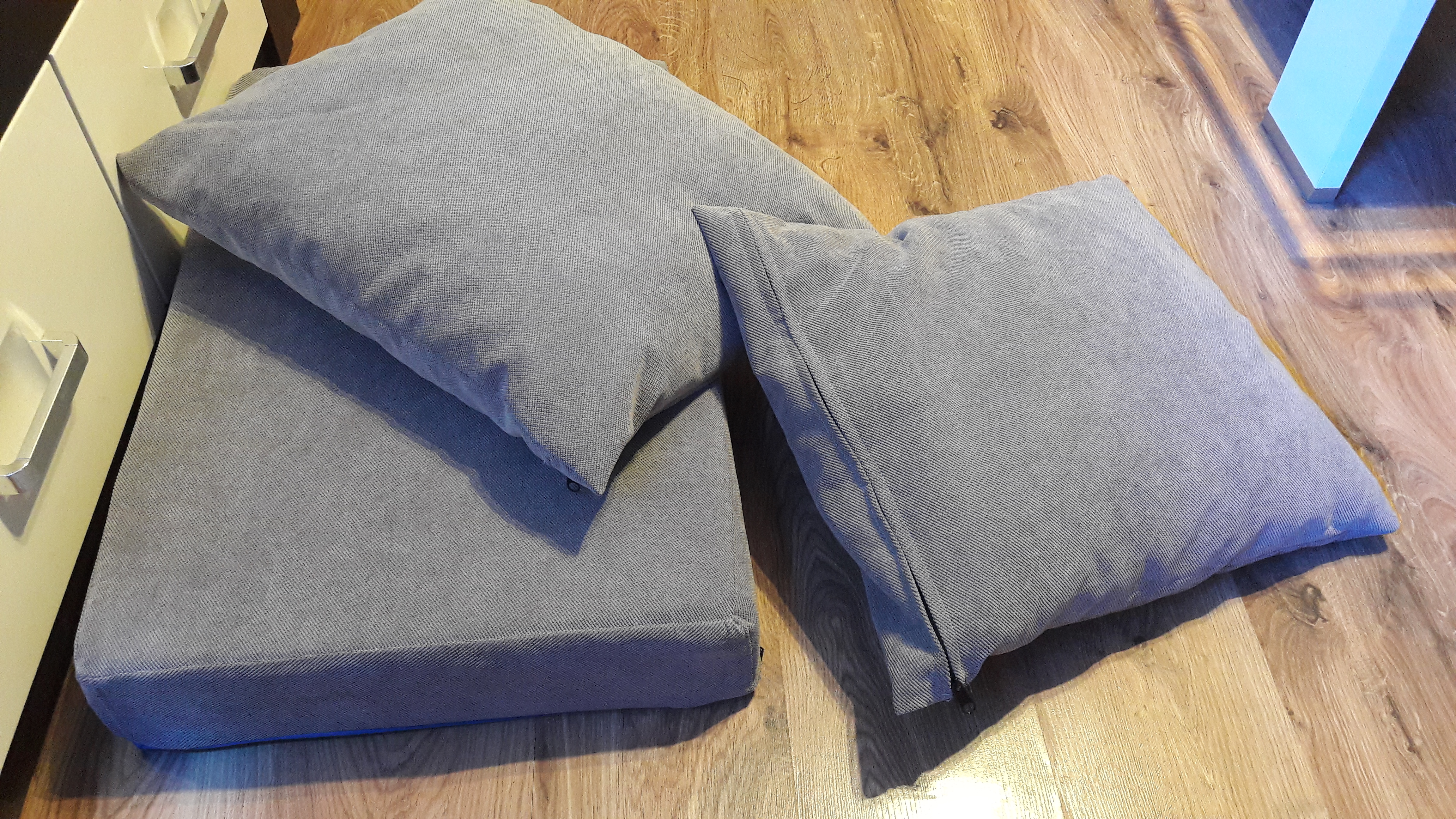 Zostało mi trochę materiału z moich robót tapicerskich. Uszyłam dzisiaj łóżeczko dla Loli i dwie poszewki na poduszki "funkcyjne" tzn takie nie do spania, tylko żeby sobie np pod plecki podłożyć.