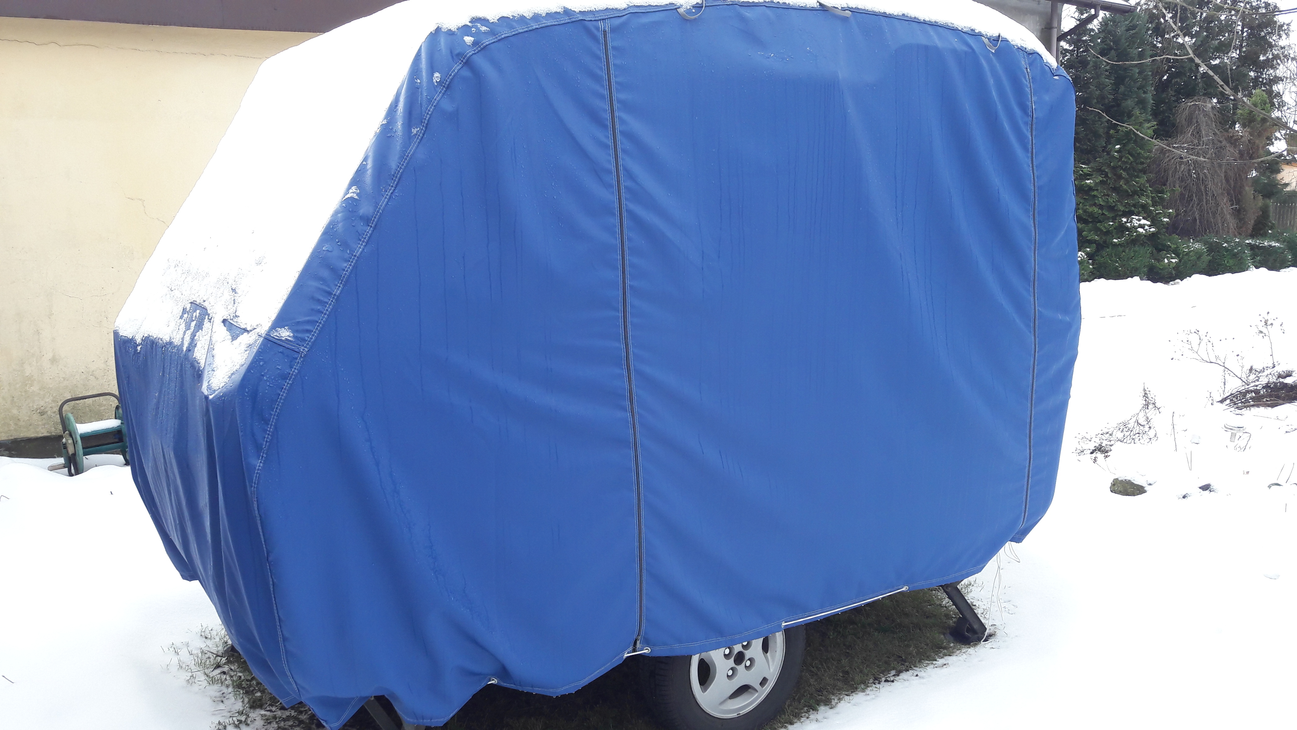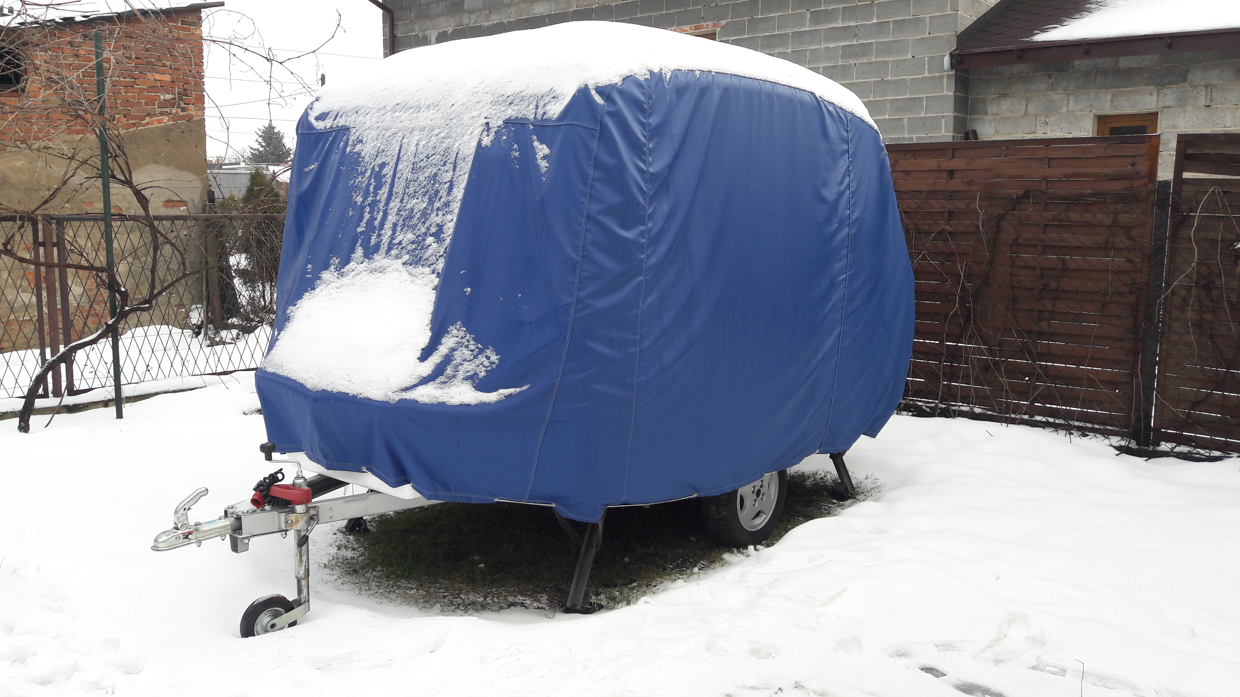 Chciałam się pochwalić, że nasza przyczepka nie doczekała się co prawda dachu nad głową, ale za to Przemek zakupił jej kurteczkę i nawet zmieścił się kufer