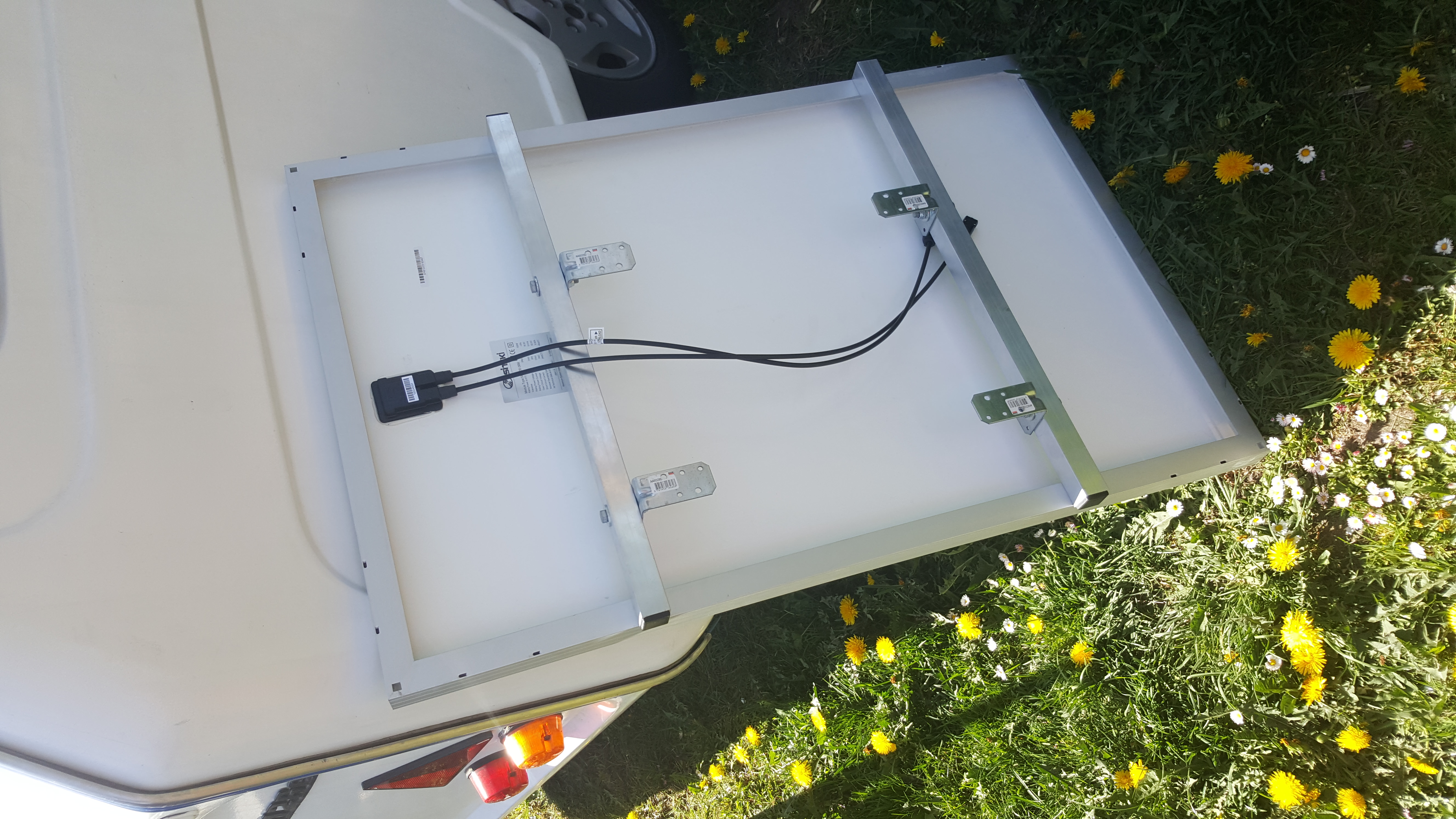 Na stelażu jest odkrecana pokrywa pod którą jest akumulator, tym samym uzyskałem miejsce na regulator i przetwornicę. Zostało ułożyć przewody na dachu, i w bakiście ale zmarznięty mokry i zły nie dam rady dziś tego zrobić.