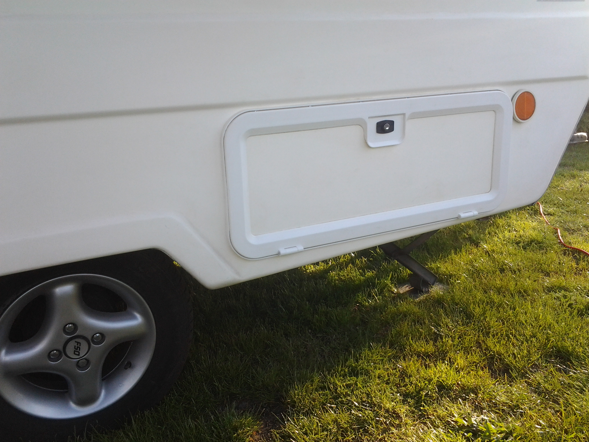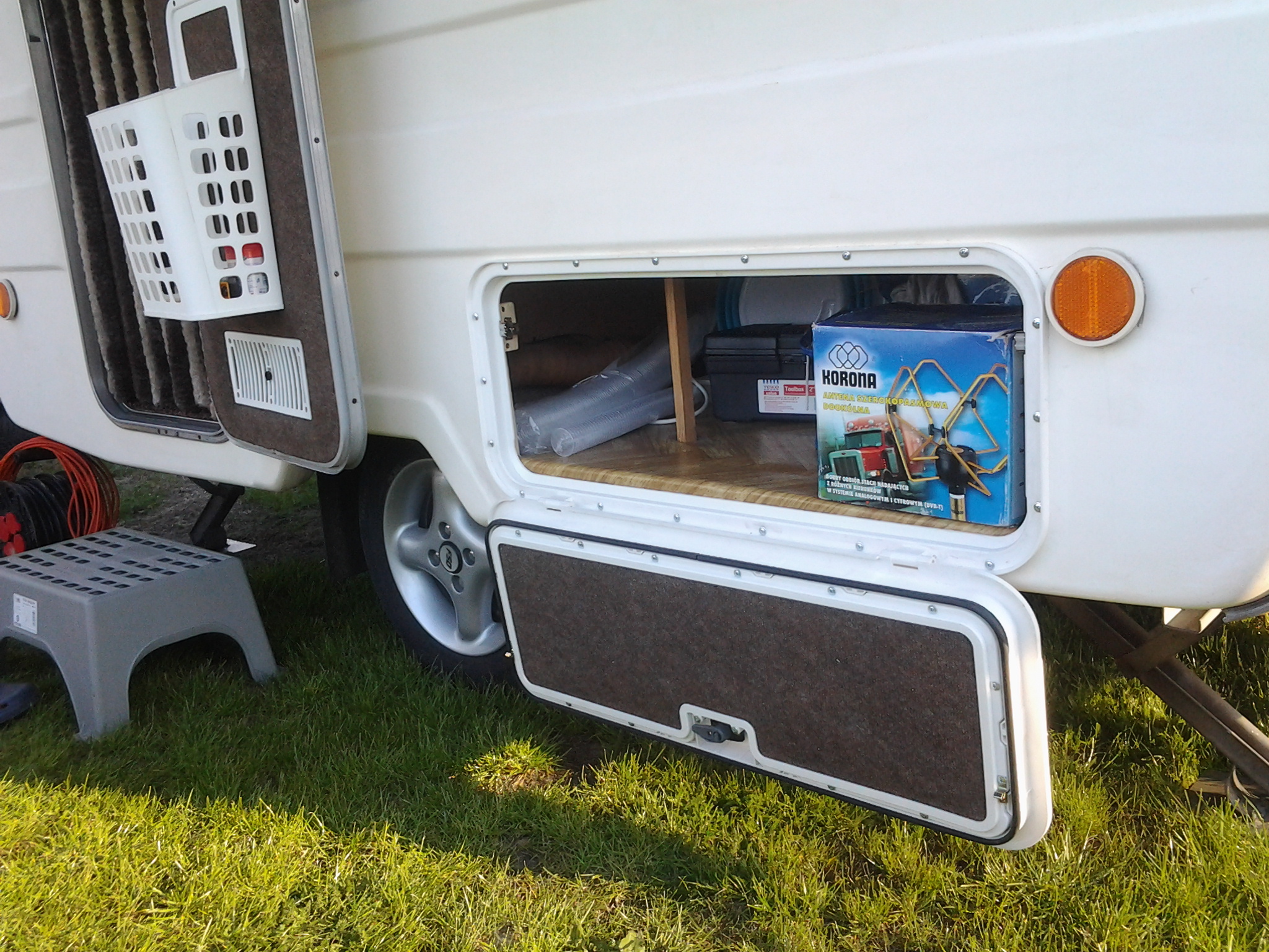 W ramach przygotowań przedmajówkowych wyciąłem otwór z boku przyczepy i zamontowałem klapę serwisową umożliwiającą łatwy dostęp z zewnąrz do kufra pod dużym łóżkiem. Na razie drzwiczki są tylko z prawej strony przyczepy, ale ich praktyczność podoba mi się do tego stopnia, że zastanawiam się nad montażem podobnych tylko nieco mniejszych także z lewej strony.