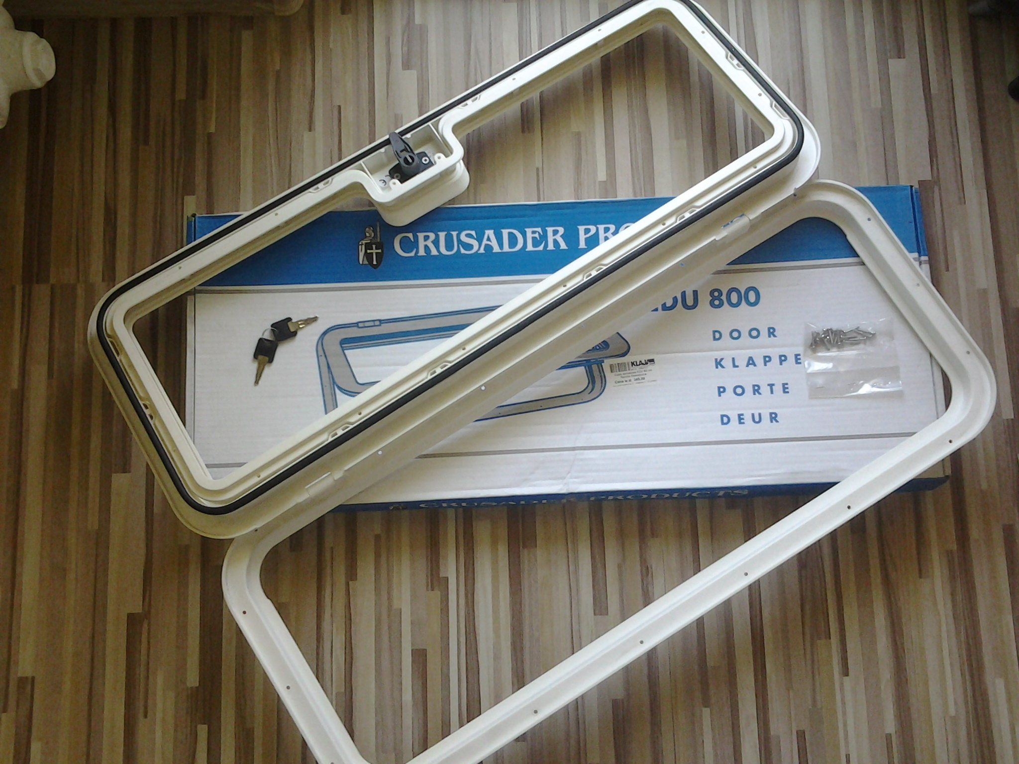 Jest to w zasadzie sama ramka, a wypełnienie jej stanowić będzie materiał wycięty z bocznej ścianki przyczepy. W komplecie: zamek, 2 kluczyki, uszczelka, wkręty montażowe (choć ja użyłem innych, bardziej dopasowanych).