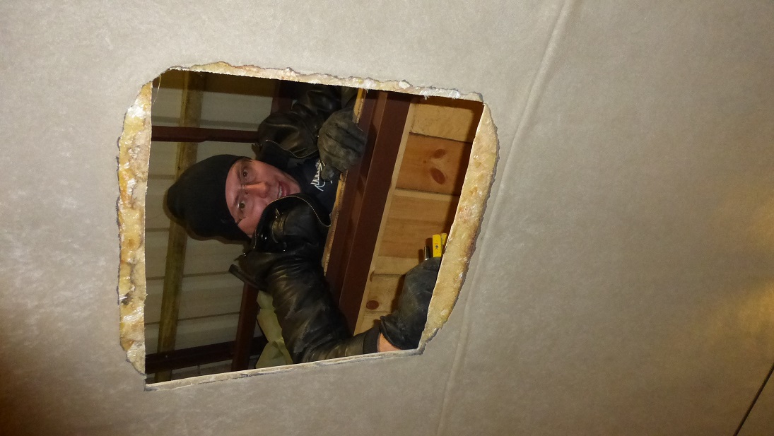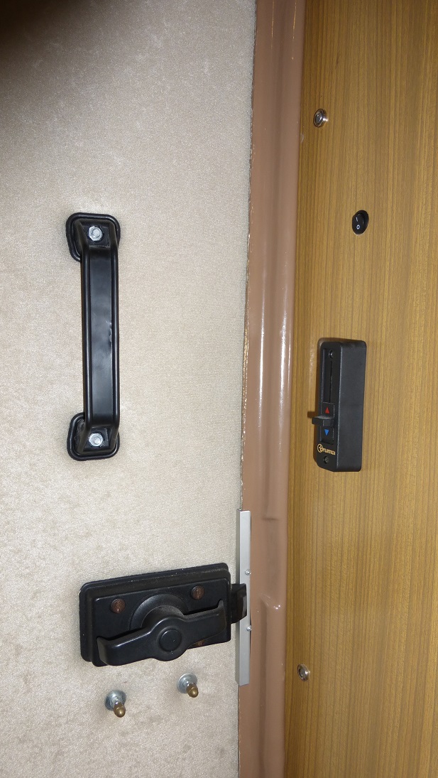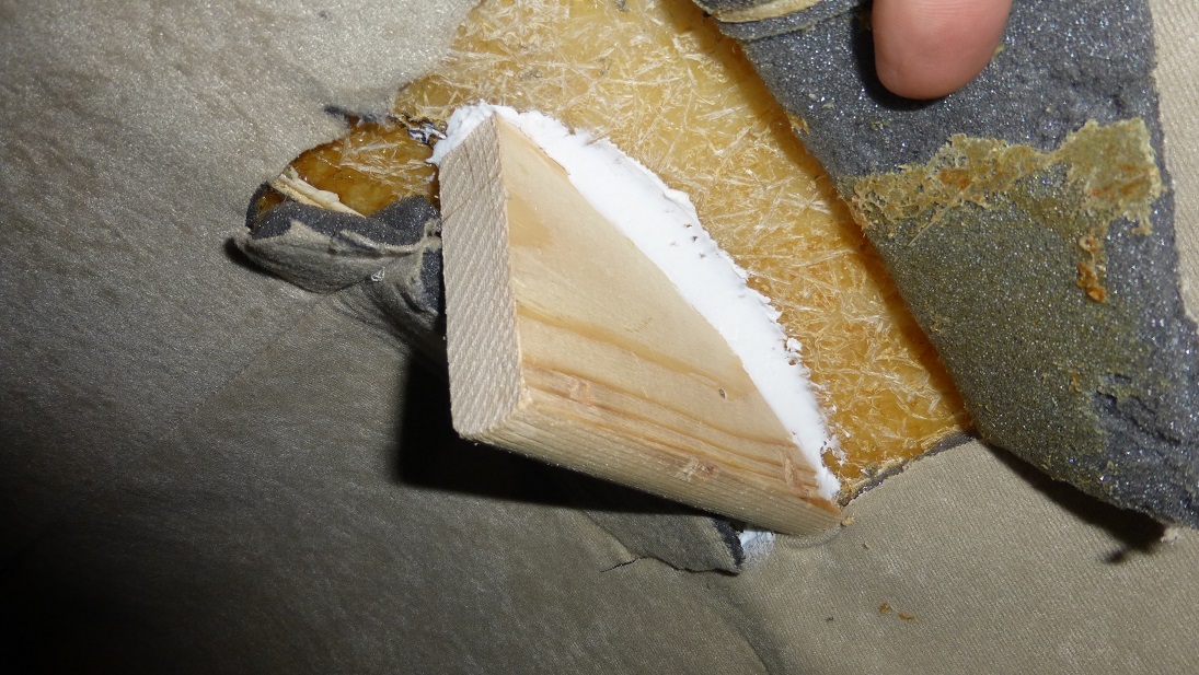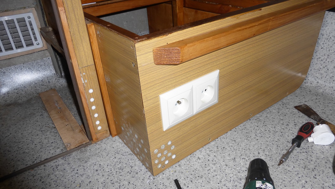 Widać masę zaszpachlowanych otworków, pozostałość po radosnej twórczości poprzedniego właściciela który chciał w ten sposób poprawić chłodzenie sporej sprężarkowej lodówki... Podmaluję to farbką w kolorze mebli i nie będzie kłuło w oczy.