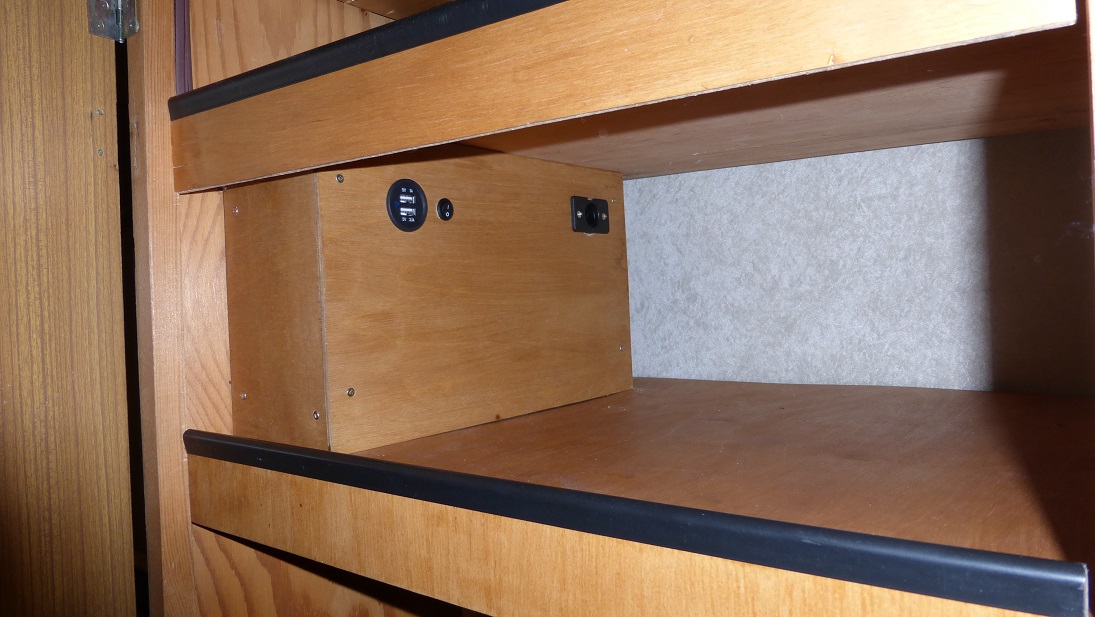 Zrobiłem zabudowę tylnej strony głośników. Pomiędzy półkami szafy powstała skrzyneczka którą wytłumiłem i przy okazji umieściłem w niej ładowarkę USB włączaną przełącznikiem i zwykłe gniazdo 12V. Obwód zabezpieczony dodatkowym bezpiecznikiem do którego dostęp jest po odjęciu przedniej ścianki.