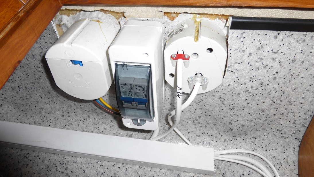 Zamontowałem też przednią małą bakistę po stronie kuchni. Znalazł się w niej identyczny zestaw kontaktów jak mam w tylnej bakiście czyli jeden (ten z bolcem) do użytku gdy przyczepa podłączona jest do 230V a drugi to napięcie podane z przetwornicy.