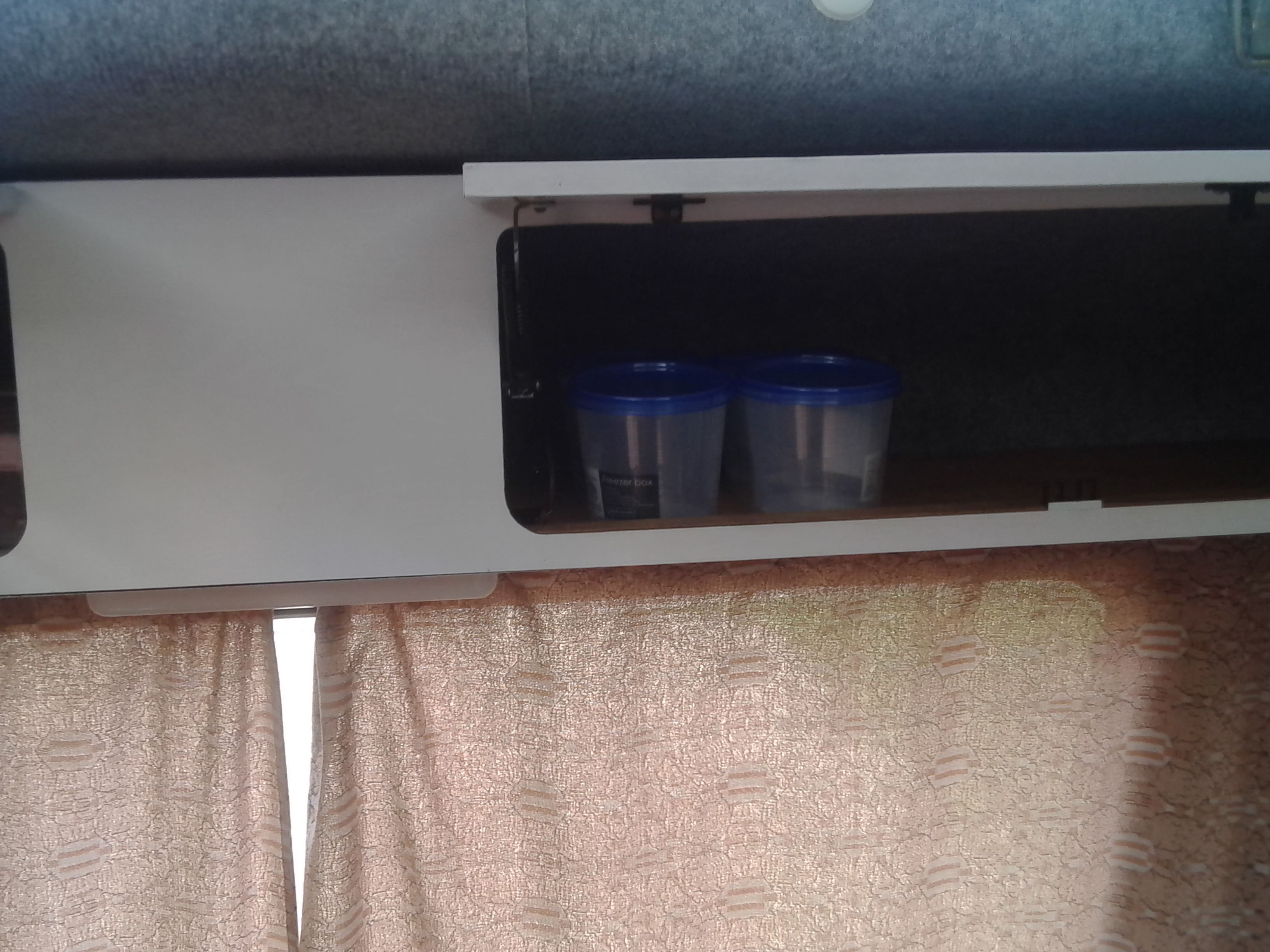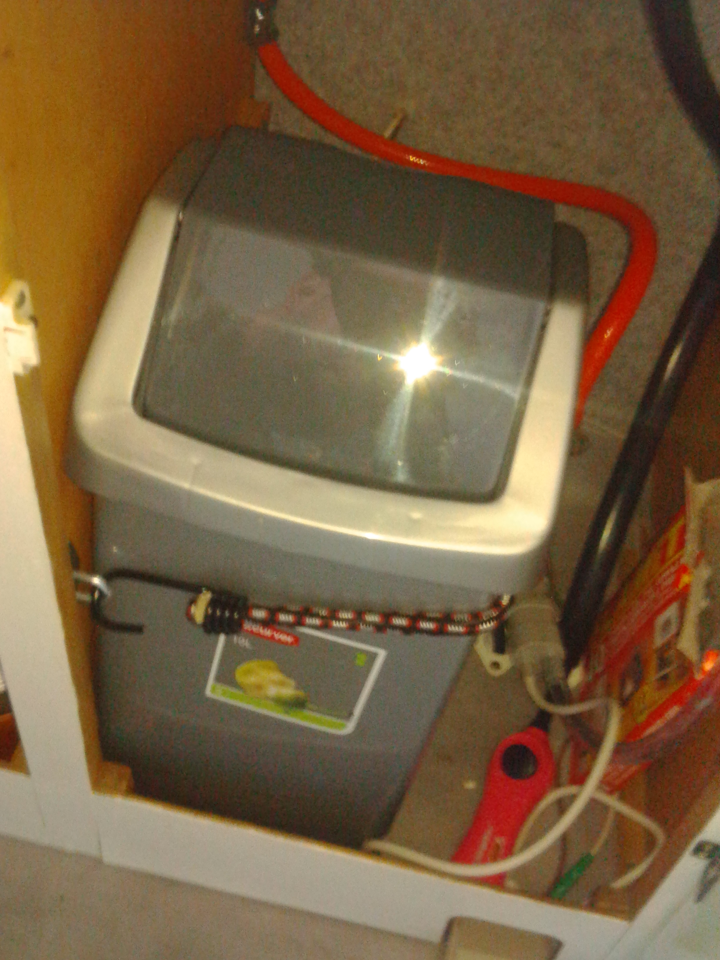 Wczoraj w wolnej chwili dorobiłem proste mocowanie śmietnika w szafce pod zlewem. Wykorzystałem do tego troczek i oczko od haczyka. Cel to bezpieczne mocowanie kosza na czas jazdy. Mocowanie trzyma dosyć pewnie, bałem się czy kosz nie będzie się wykrzywiać/wypadać ale jest ok.