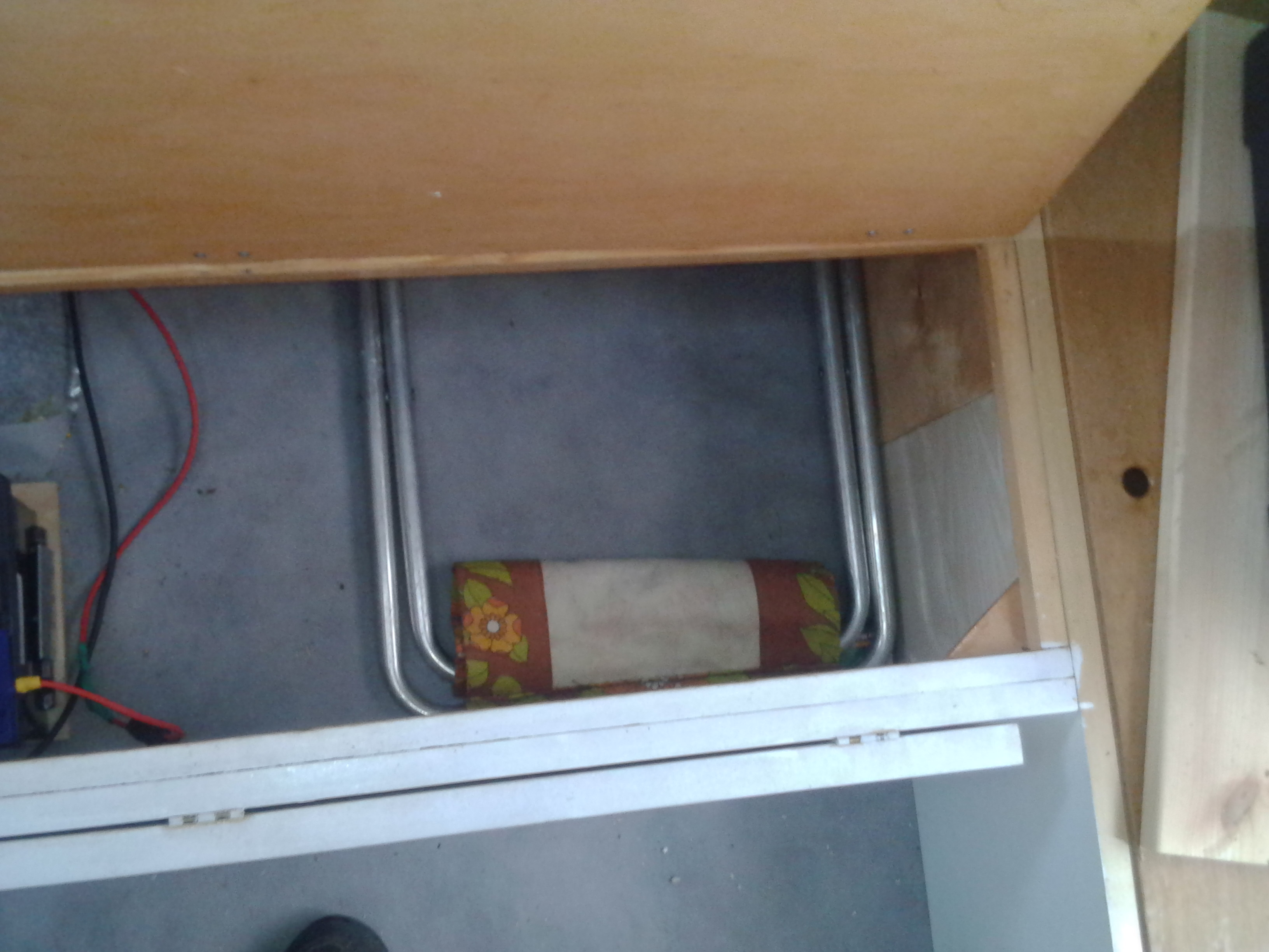 Miejsce transportowe krzesełek. W "oknie" między nogami (jakkolwiek to brzmi) trafi koszyk na buty - plan jest taki że w przyczepce każda rzecz będzie miała swoje dokładnie ustalone miejsce.